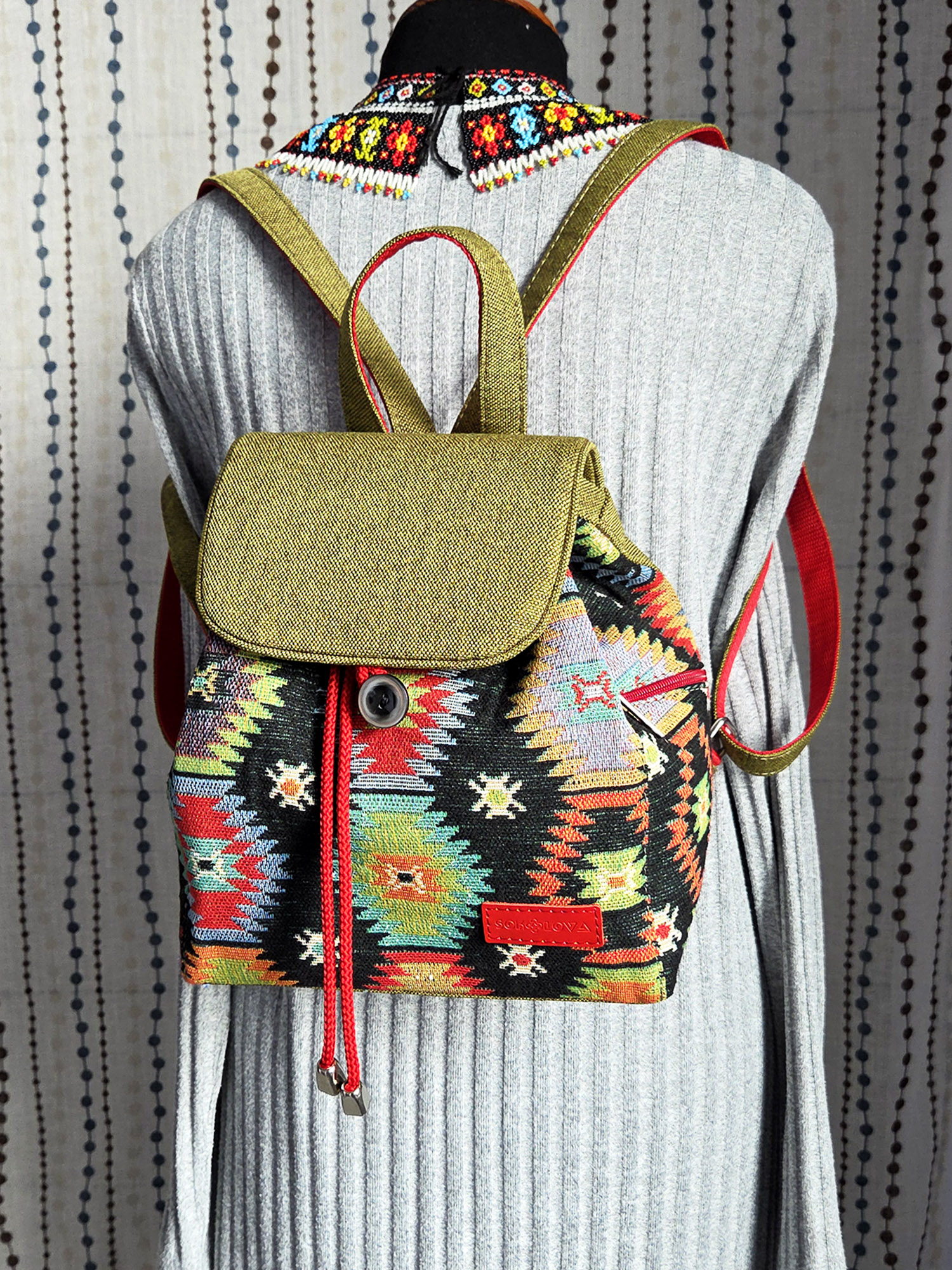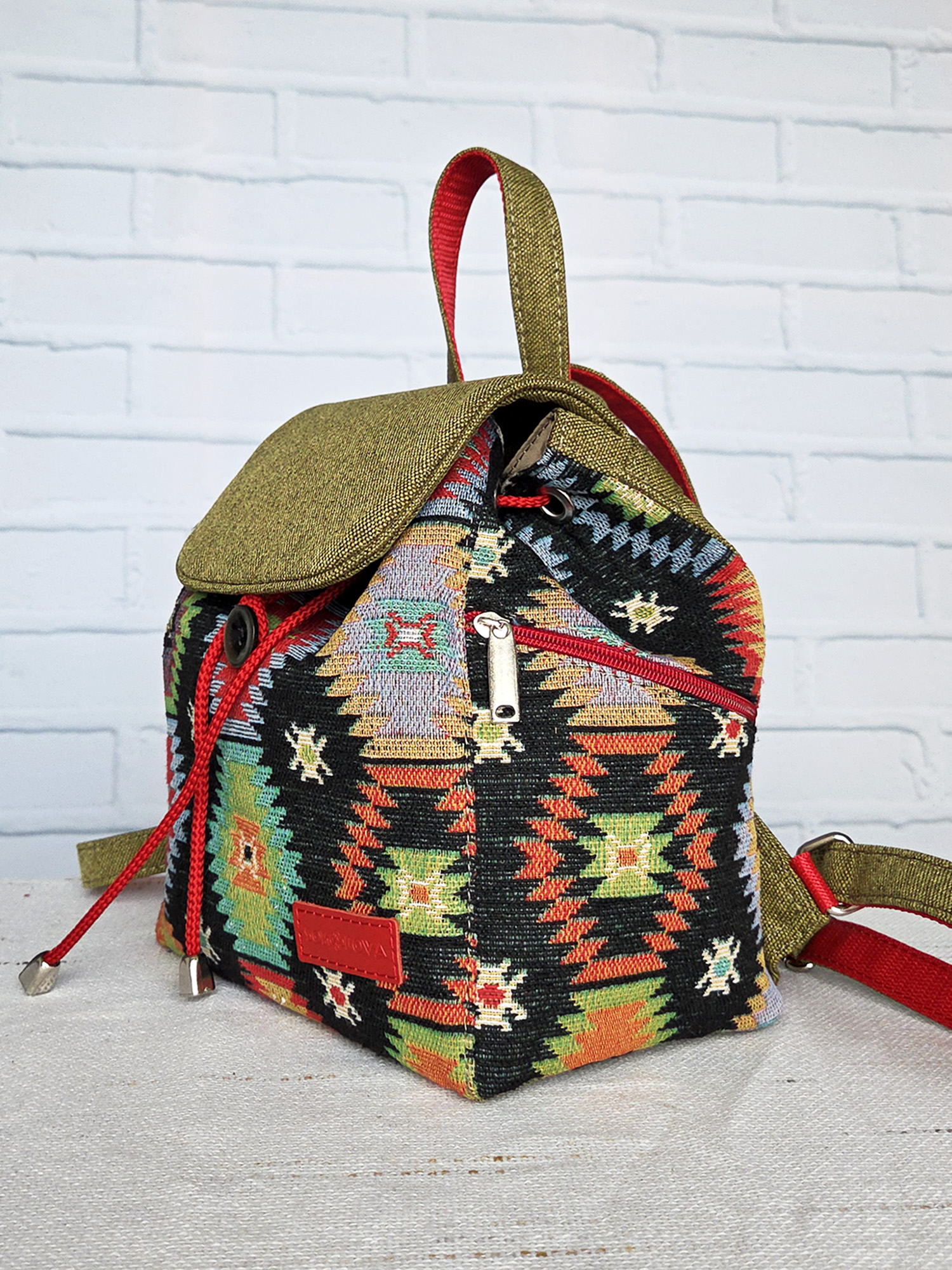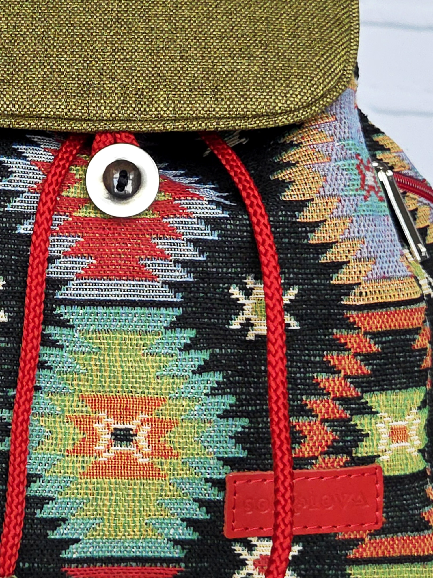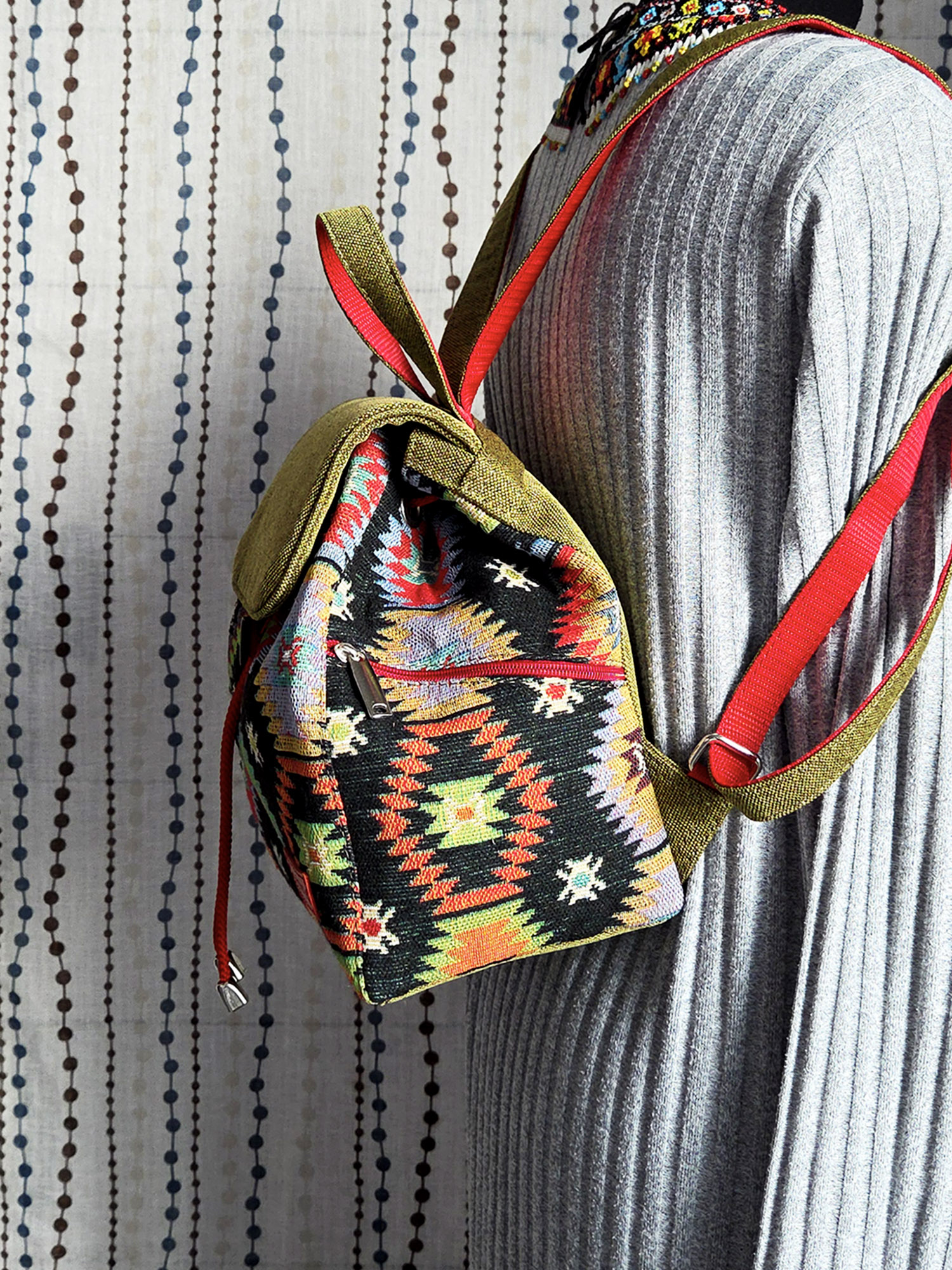 Яскравий наплічник «Міське етно» з геометричним візерунком створений дизайнеркою Sokolova для тих, хто цінує автентичність та шукає аксесуар з особливим настроєм. Поєднання соковитих кольорів та фактурного гобелена робить його ідеальним акцентом як для подорожей, так і для міських буднів.