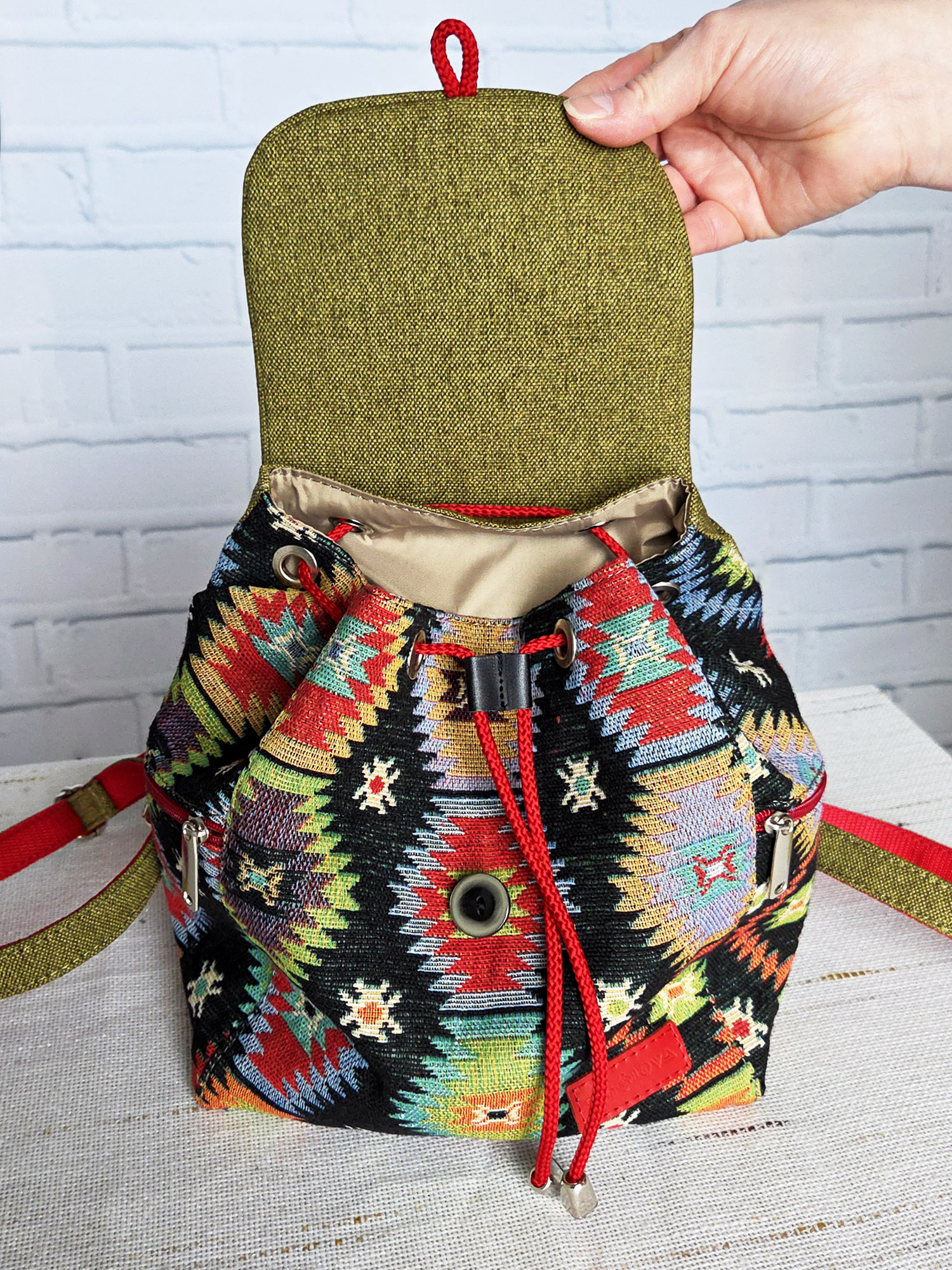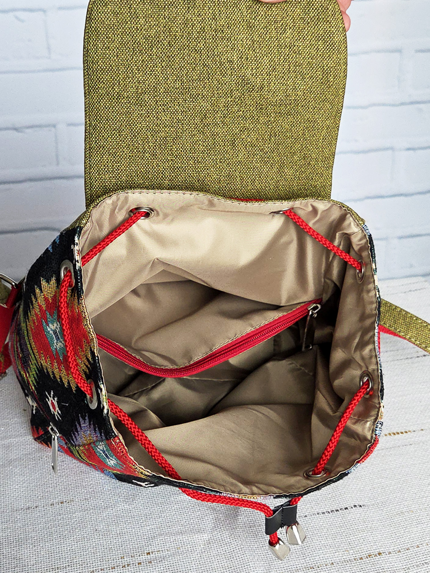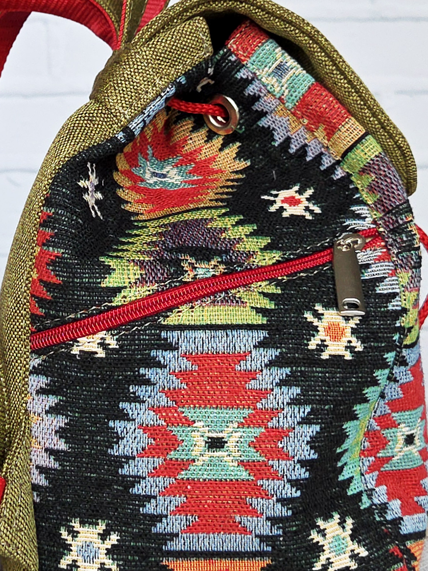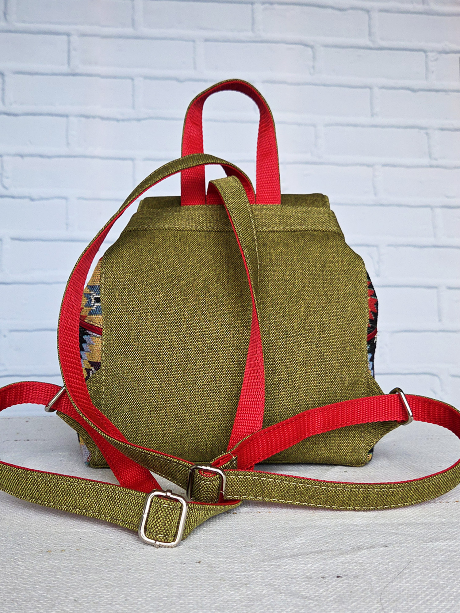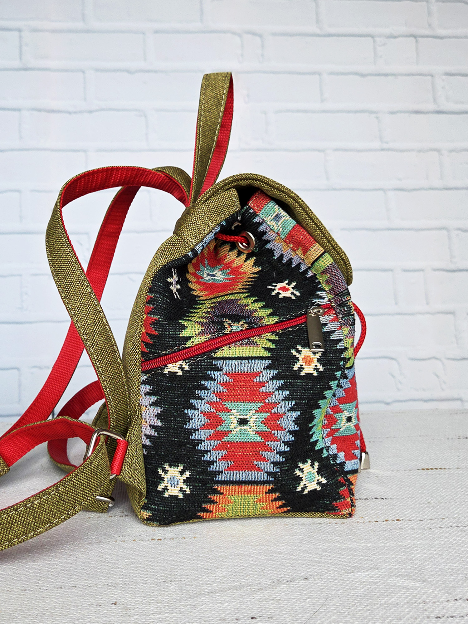 Яскравий наплічник «Міське етно» з геометричним візерунком створений дизайнеркою Sokolova для тих, хто цінує автентичність та шукає аксесуар з особливим настроєм. Поєднання соковитих кольорів та фактурного гобелена робить його ідеальним акцентом як для подорожей, так і для міських буднів.