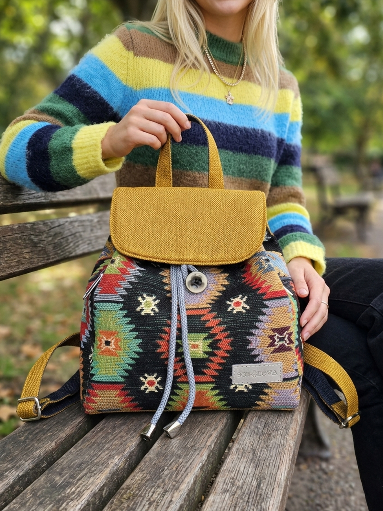 Яскравий наплічник «Street Ethno» з геометричним візерунком створений дизайнеркою Sokolova для тих, хто цінує автентичність та шукає аксесуар з особливим настроєм. Поєднання соковитих кольорів та фактурного гобелена робить його ідеальним акцентом як для подорожей, так і для міських буднів.
