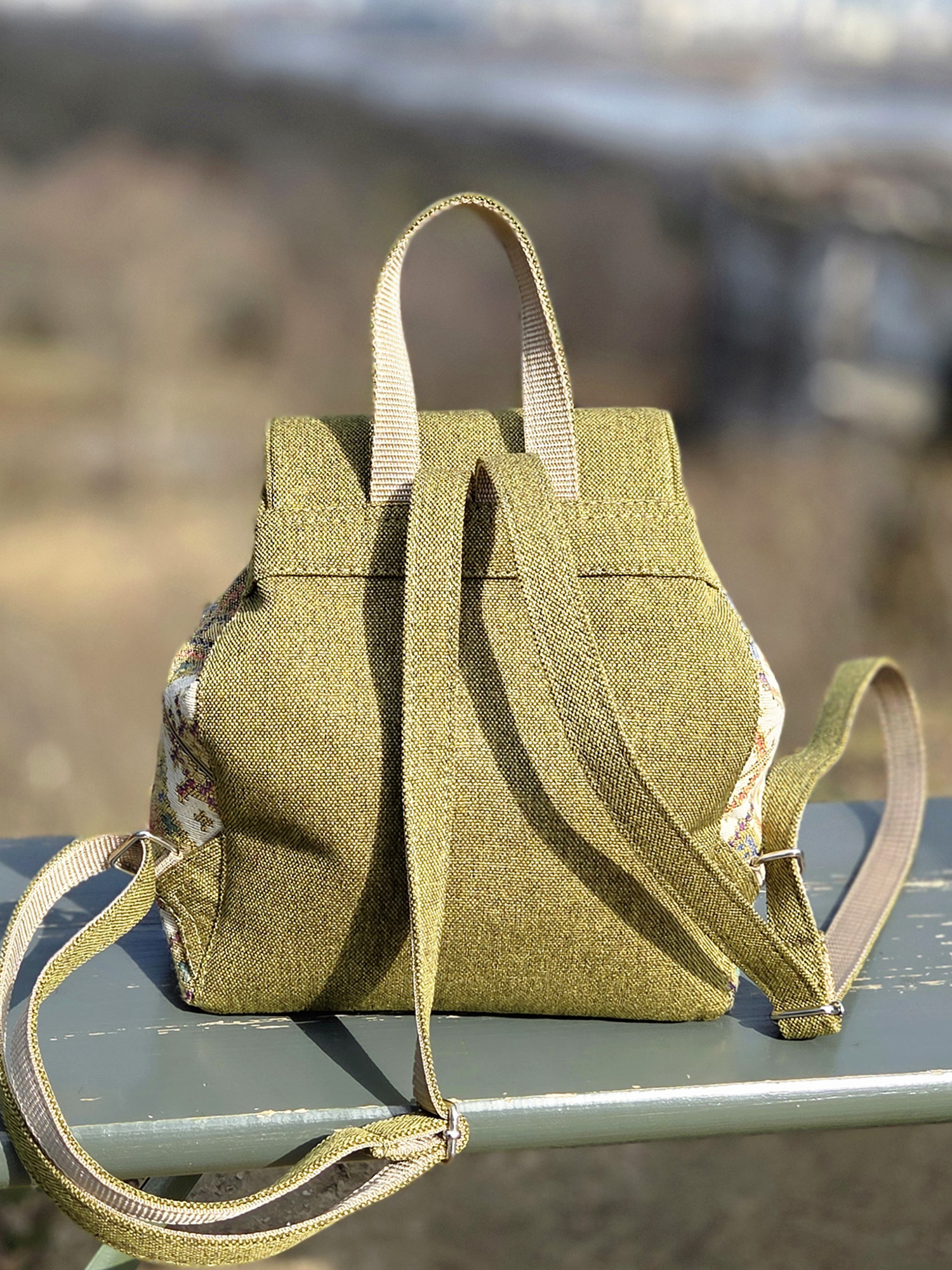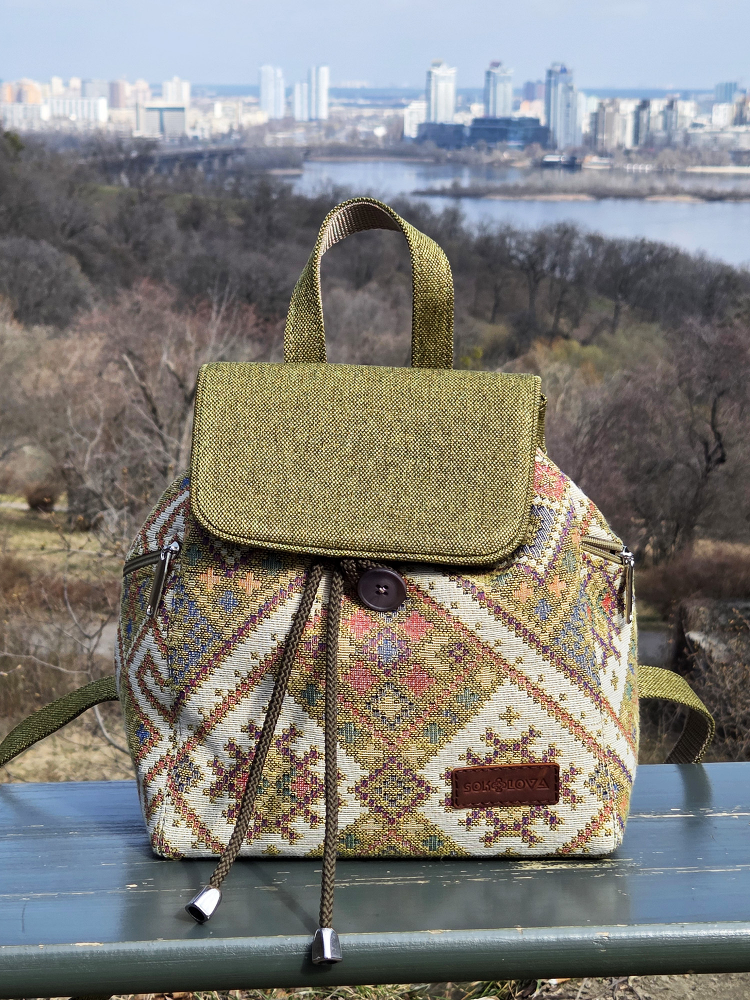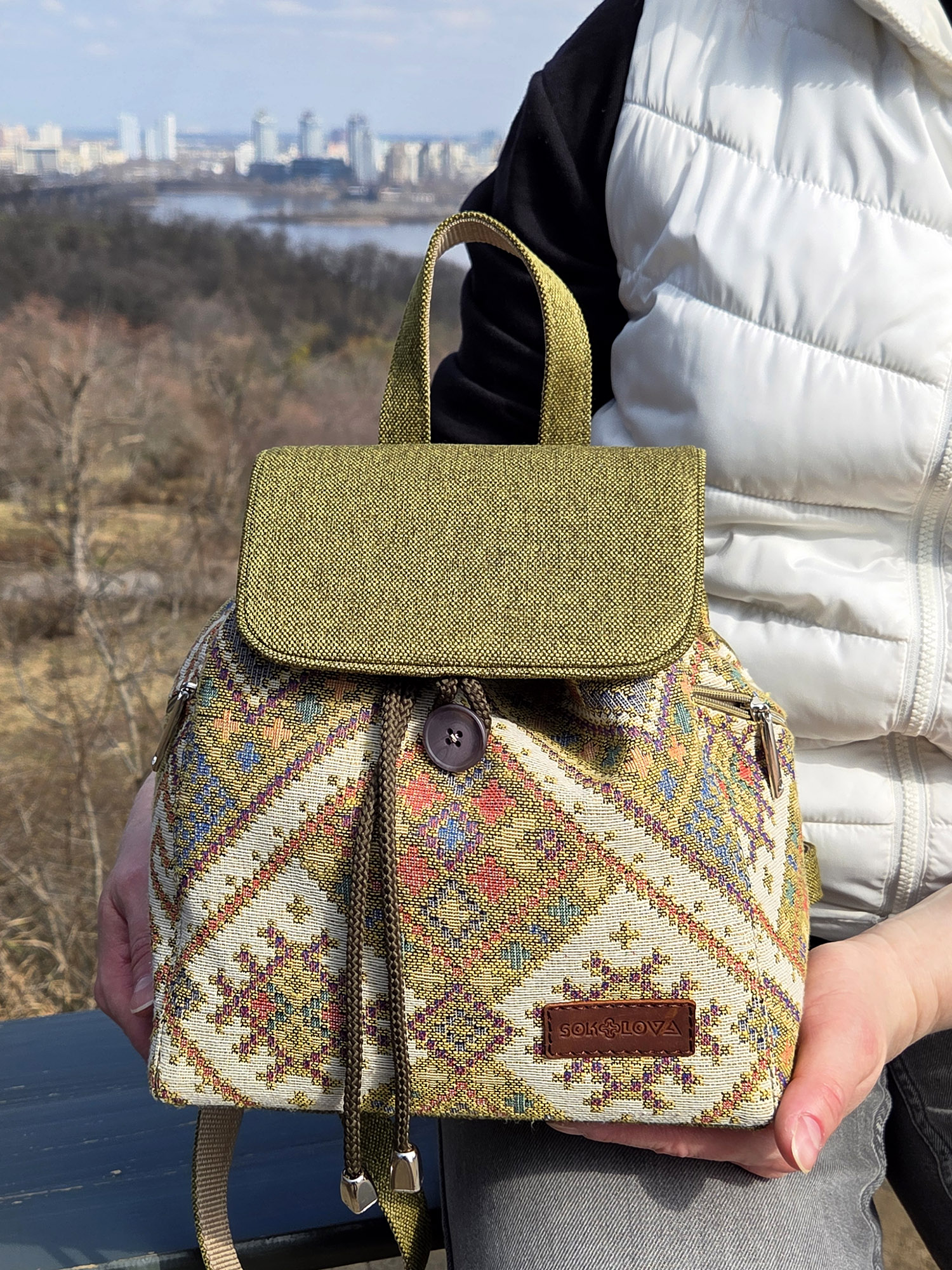 Оливковий рюкзак від Sokolova — знахідка для тих, хто цінує поєднання сучасної моди та рідного стилю. Гобелен з орнаментом, що нагадує традиційну українську вишивку, робить цей рюкзак не просто річчю, а справжнім оберегом вашого образу.