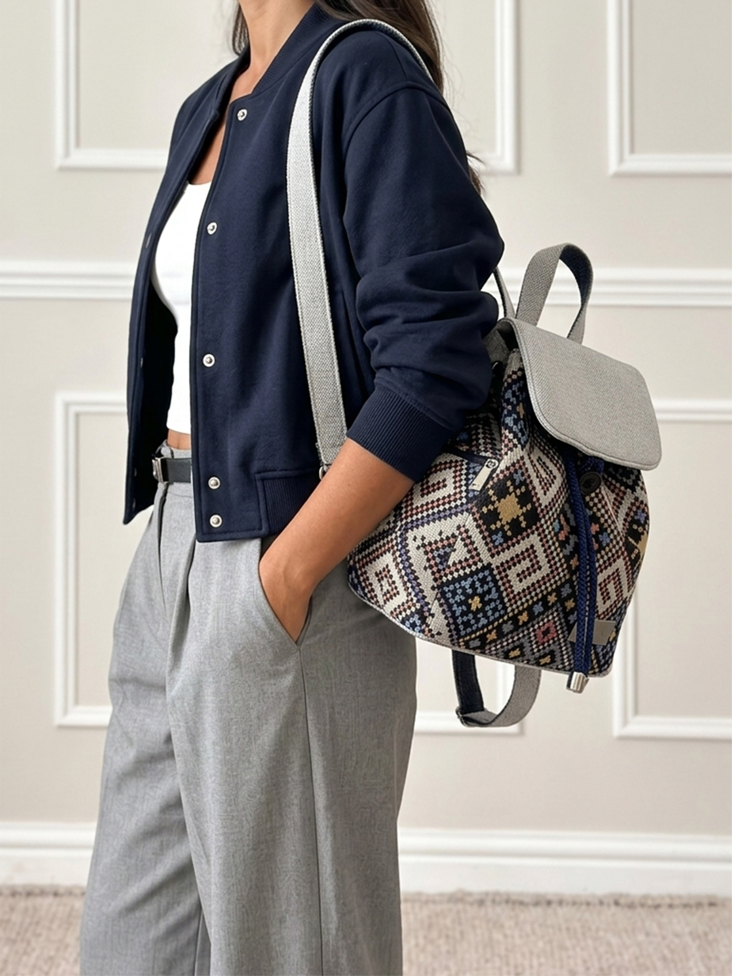 🤍 Вишукана комбінація фактур: Основна частина рюкзака виконана з гобелена. Клапан, ручка та лямки зроблені з міцної сірої рогожки. Всі тканини зносостійкі, чудово тримають форму та приємні на дотик.