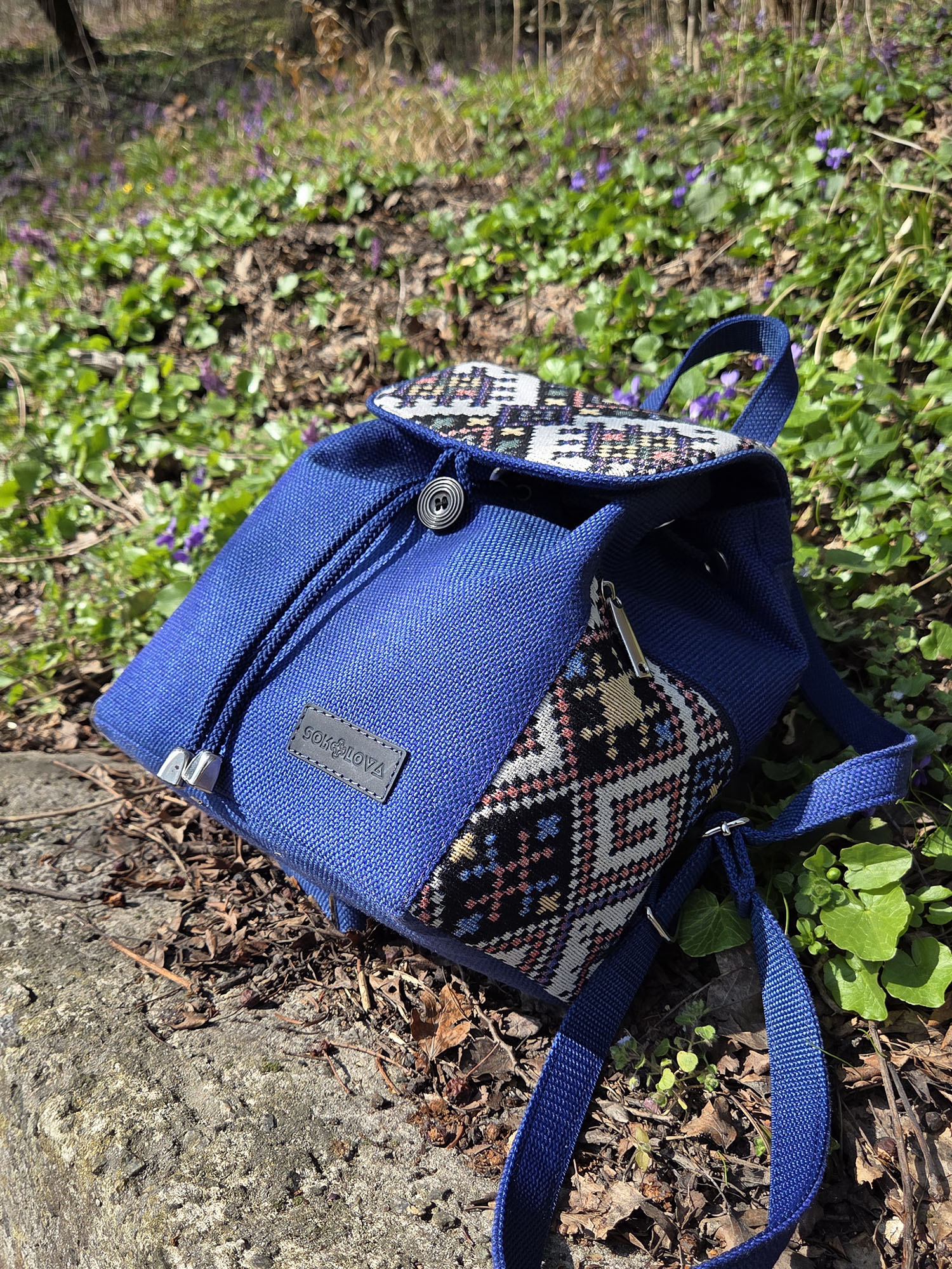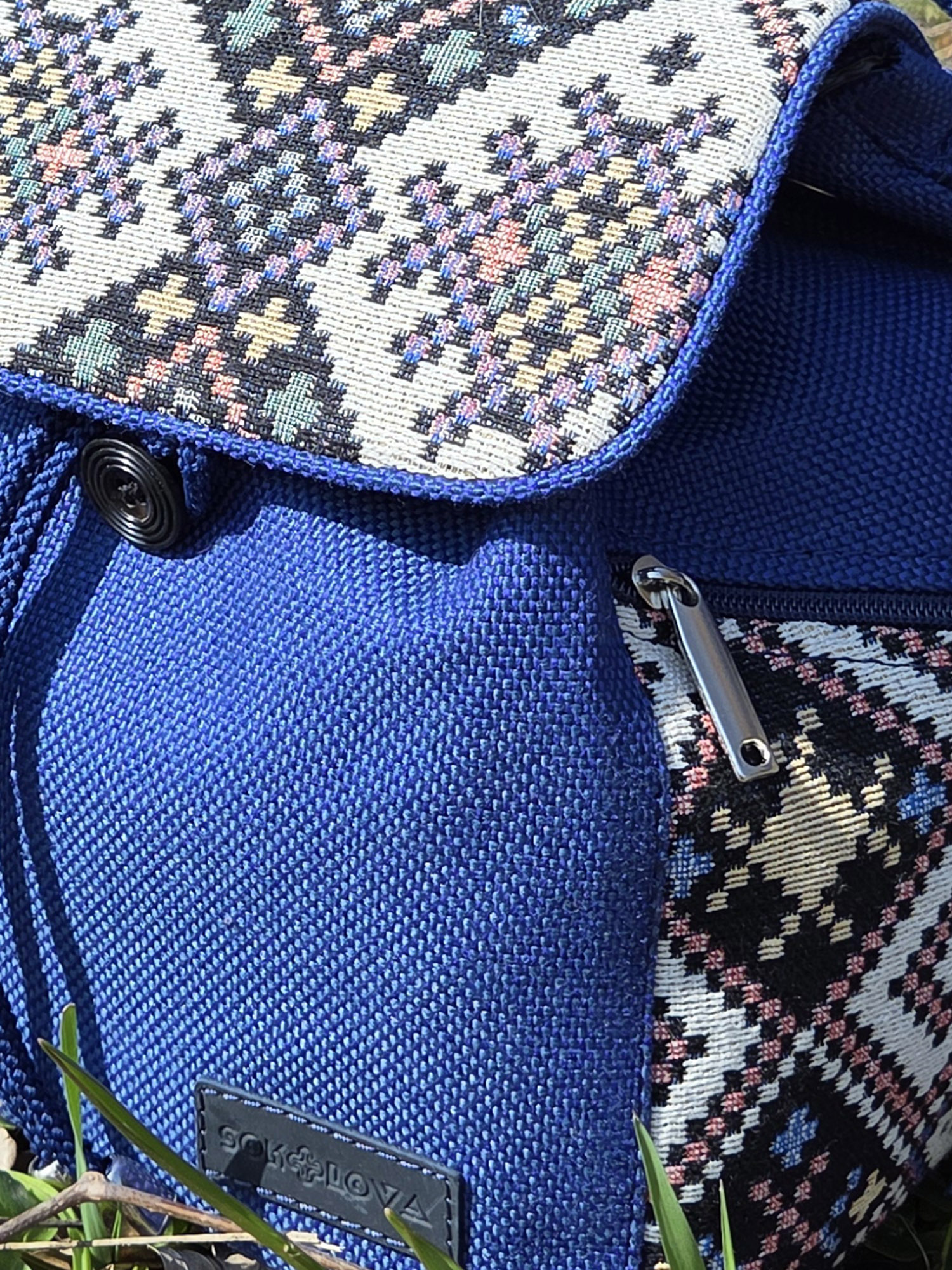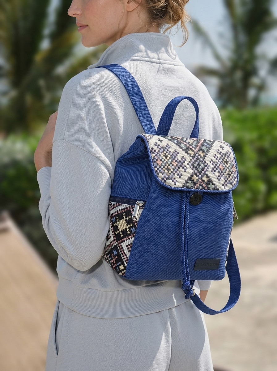 💙 Вишукана комбінація фактур: Клапан та бічна кишеня рюкзака виконані з візерунчастого гобелена. Основна частина, ручка та лямки зроблені з міцної синьої рогожки. Всі тканини зносостійкі, чудово тримають форму та приємні на дотик.