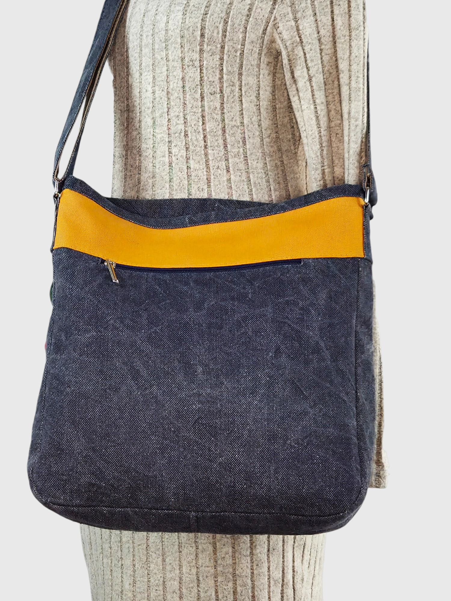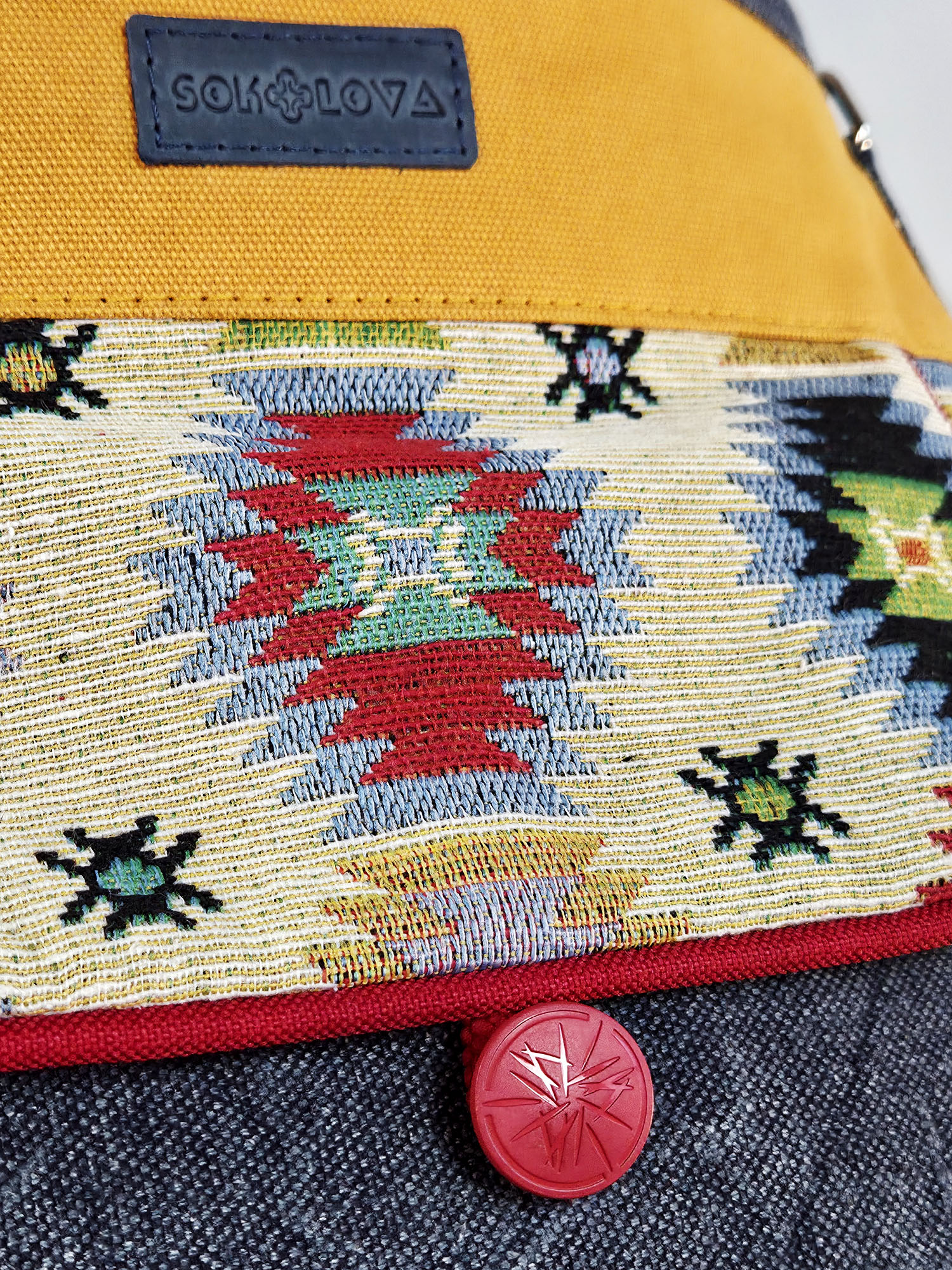 ✨ Матеріали та якість: Основа виконана із канвасу синього кольору, що ідеально гармоніює з багатобарвним геометричним орнаментом із гобелену. Міцні та зносостійкі матеріали дозволяють виробу чудово тримати форму, а надійна фурнітура гарантує довговічність.