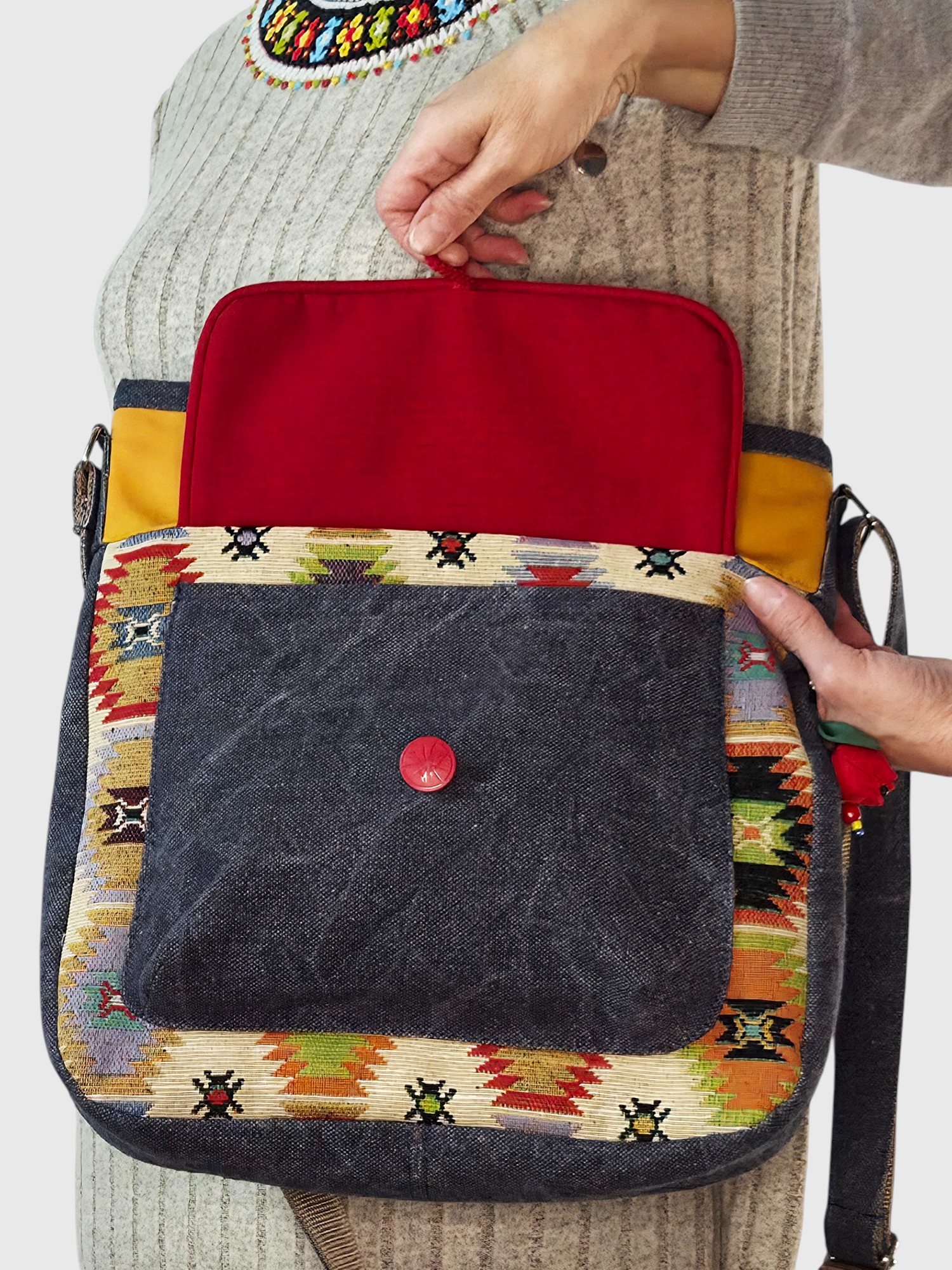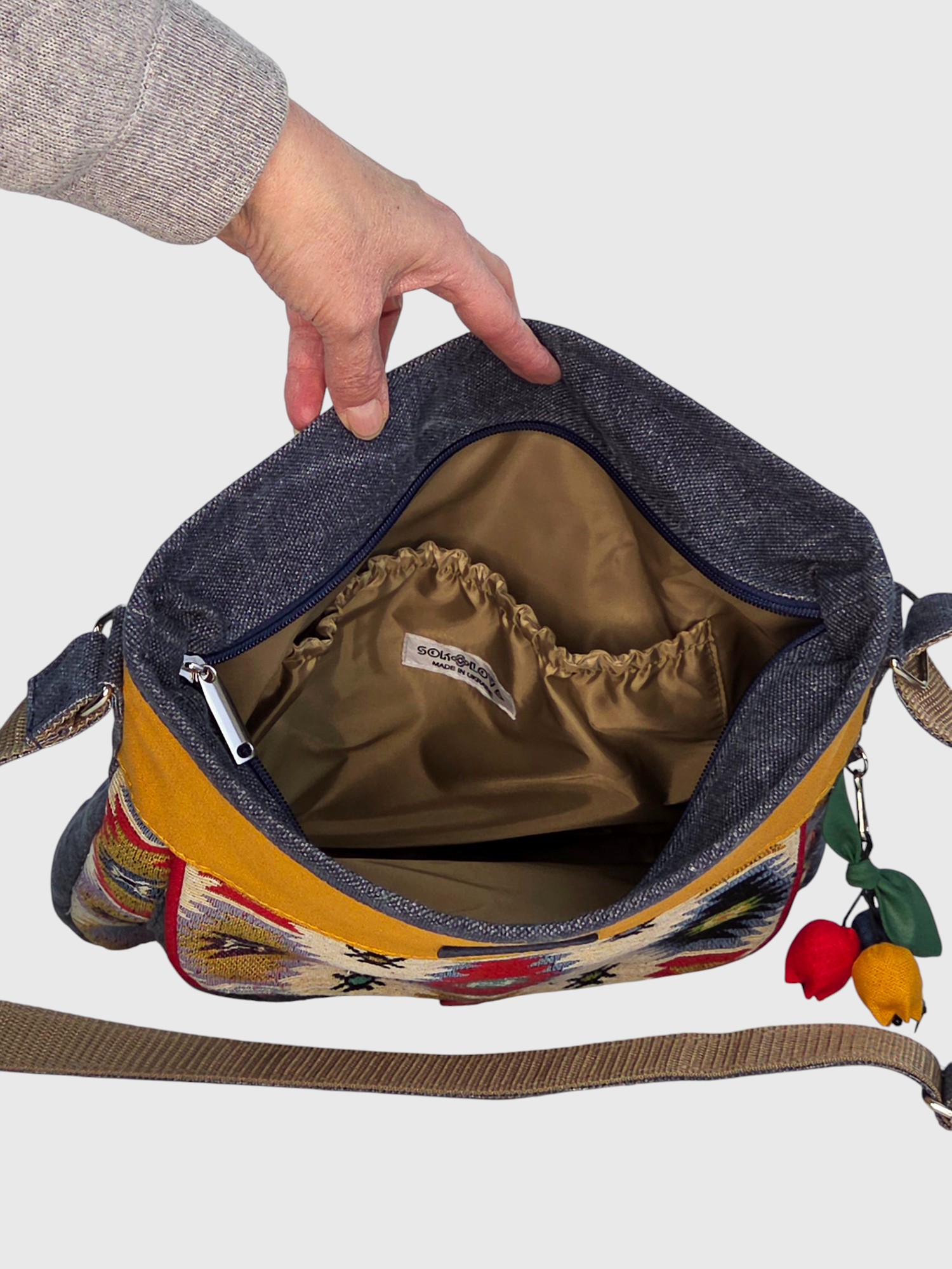 Яскрава сумка у бохо-стилі моделі “Мандри” створена, щоб дарувати настрій та забезпечувати комфорт у кожному кроці — чи то прогулянка містом, чи захоплива подорож. Вона легка, але містка: все необхідне завжди буде під рукою.