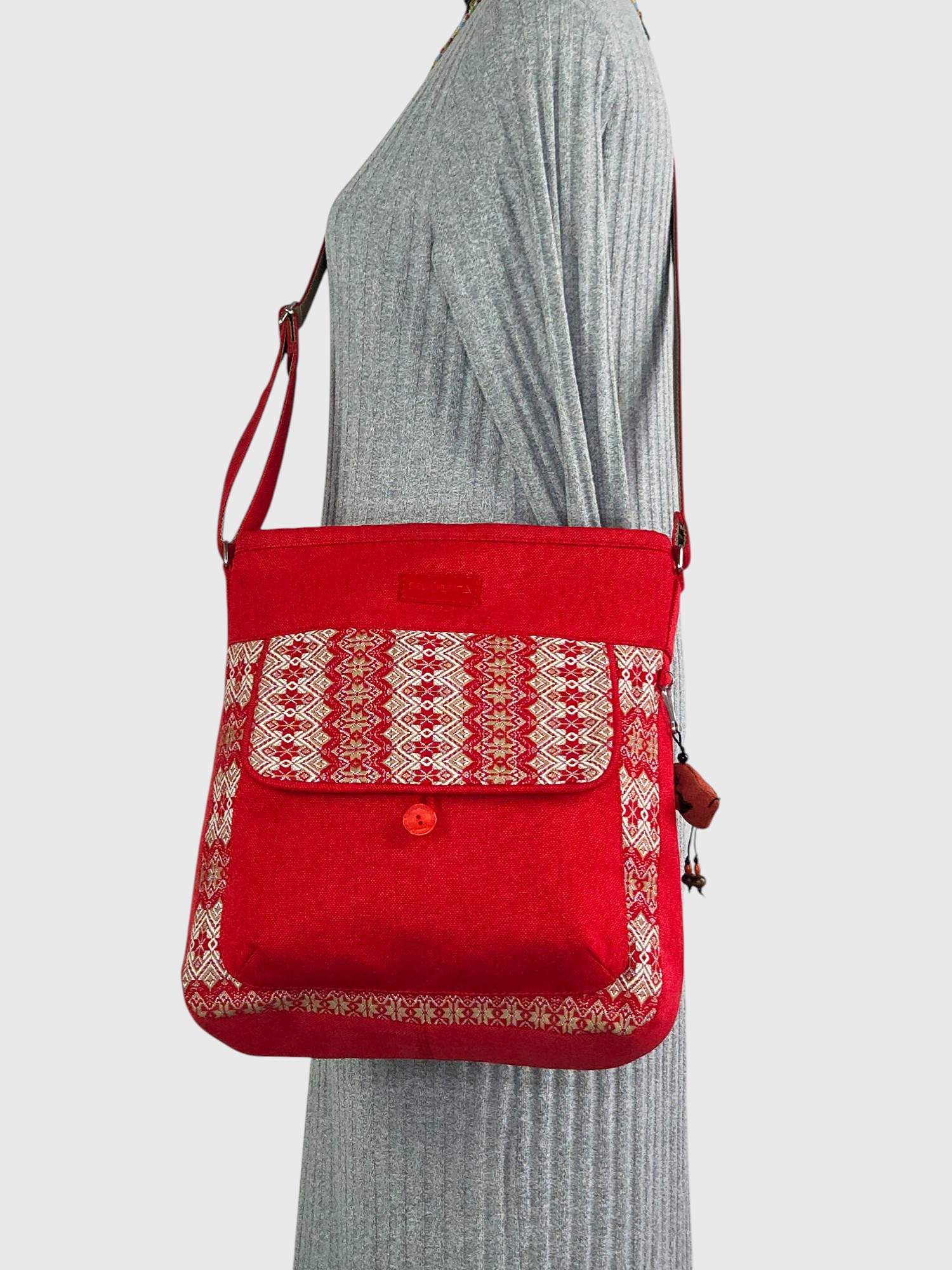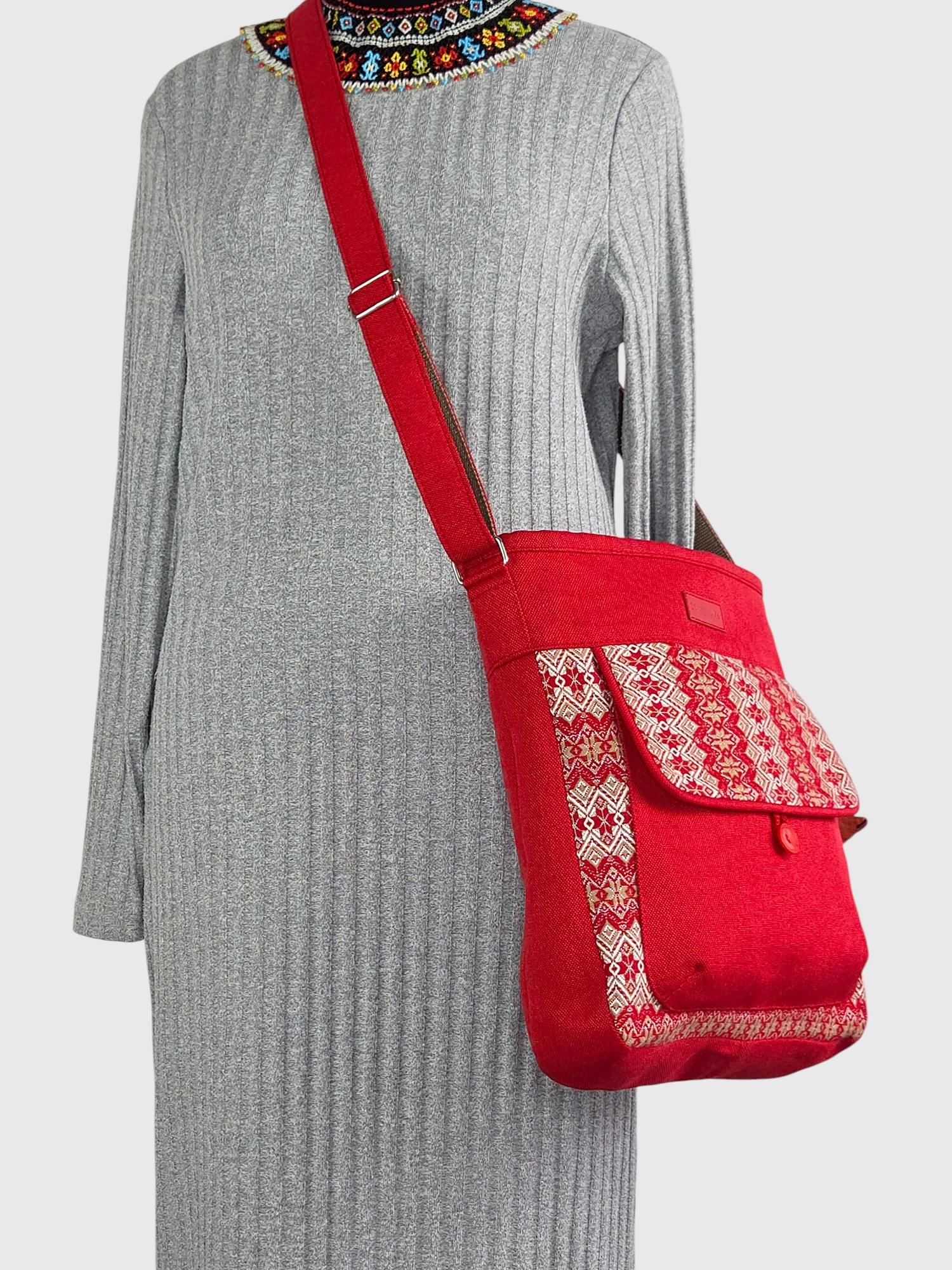 Червона сумка моделі «Мандри» з автентичним орнаментом — стильний вибір для тих, хто не боїться бути в центрі уваги.