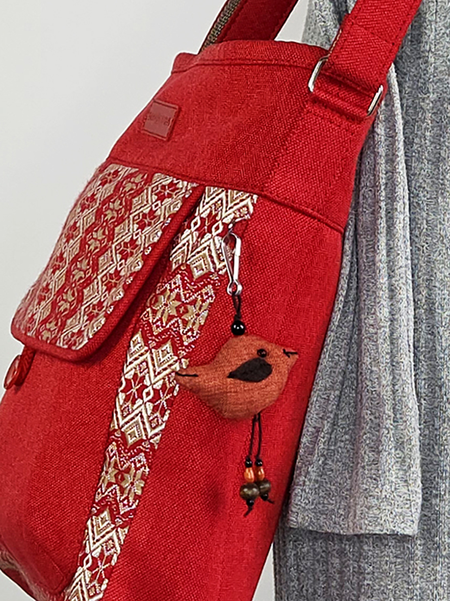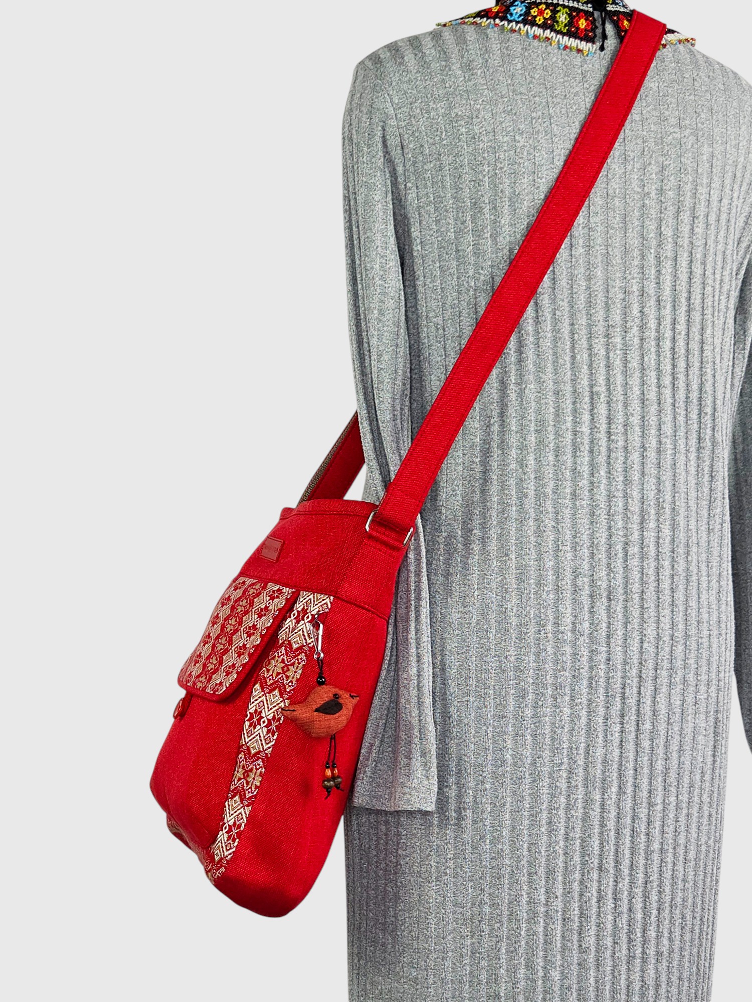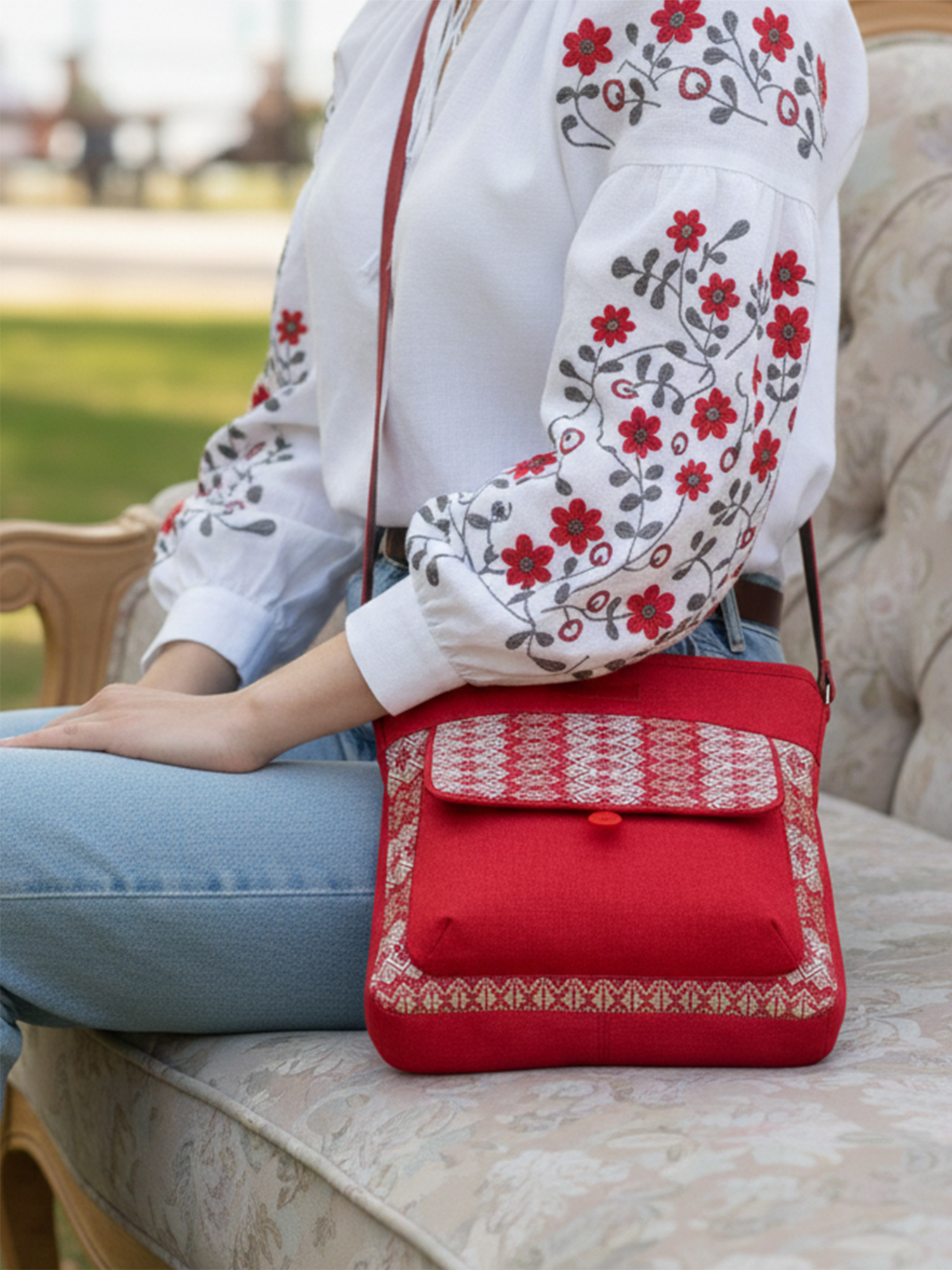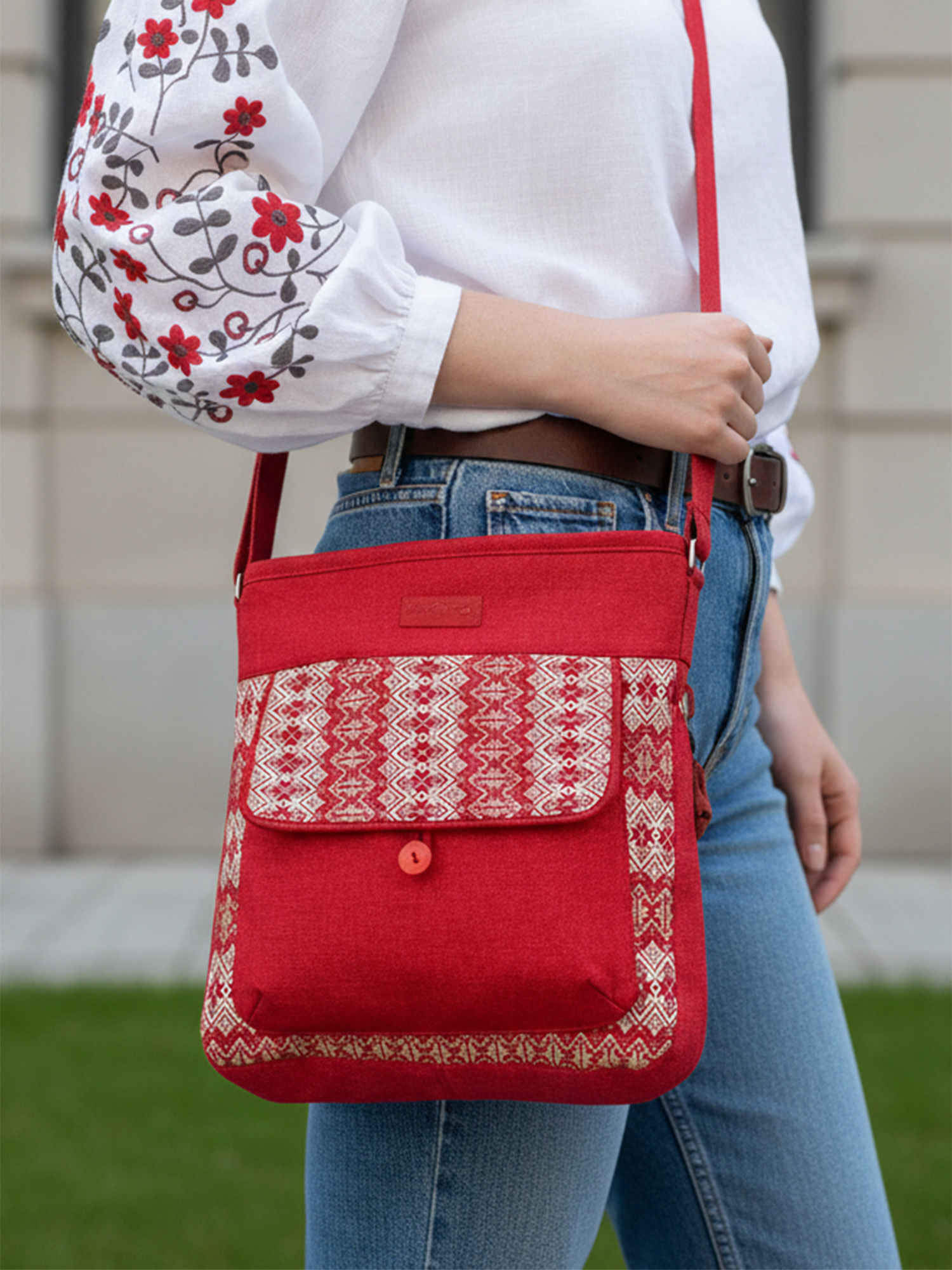 Ця сумка поєднує в собі енергію насиченого червоного кольору та витонченість світлого візерунка в народному стилі.