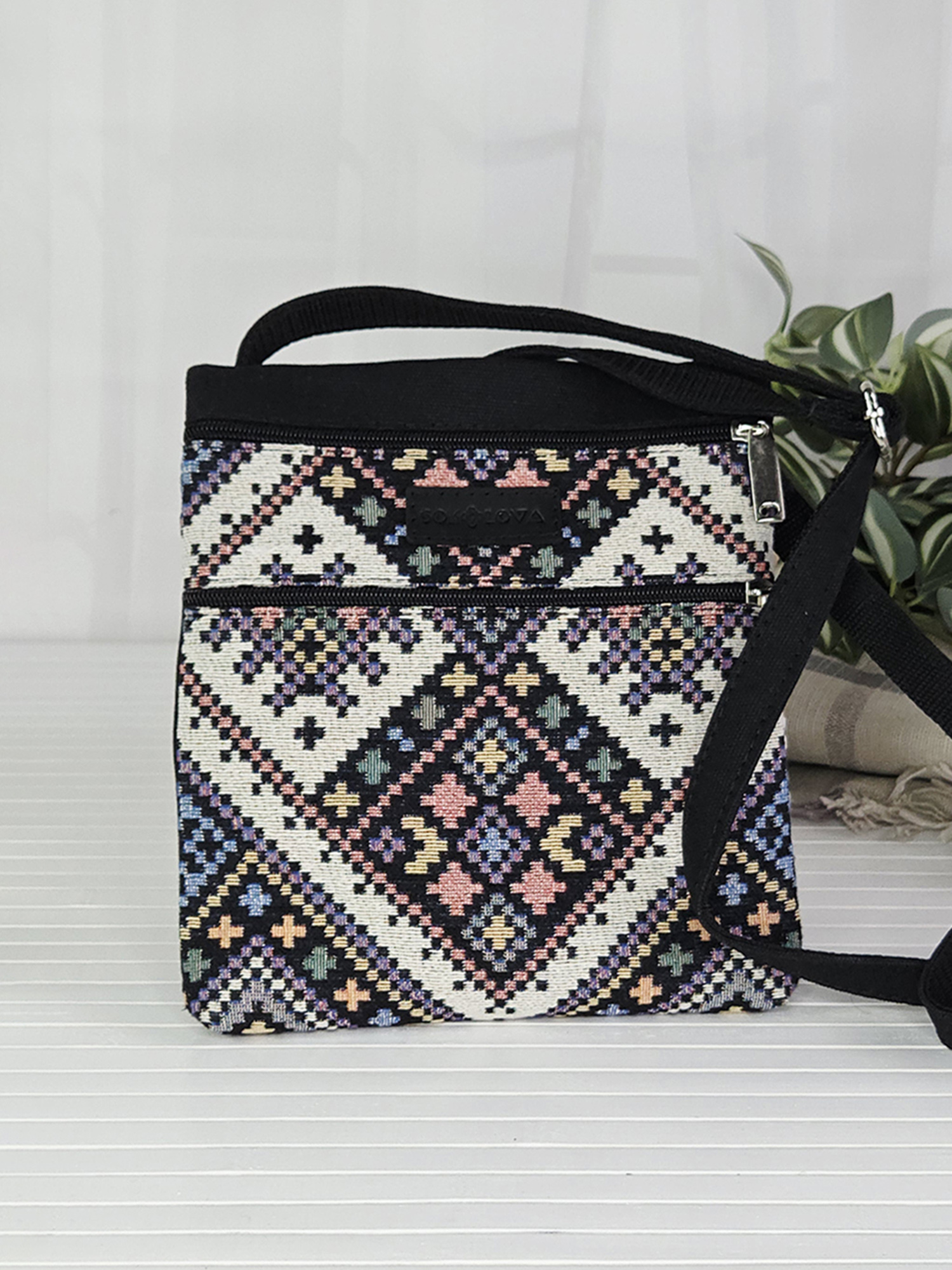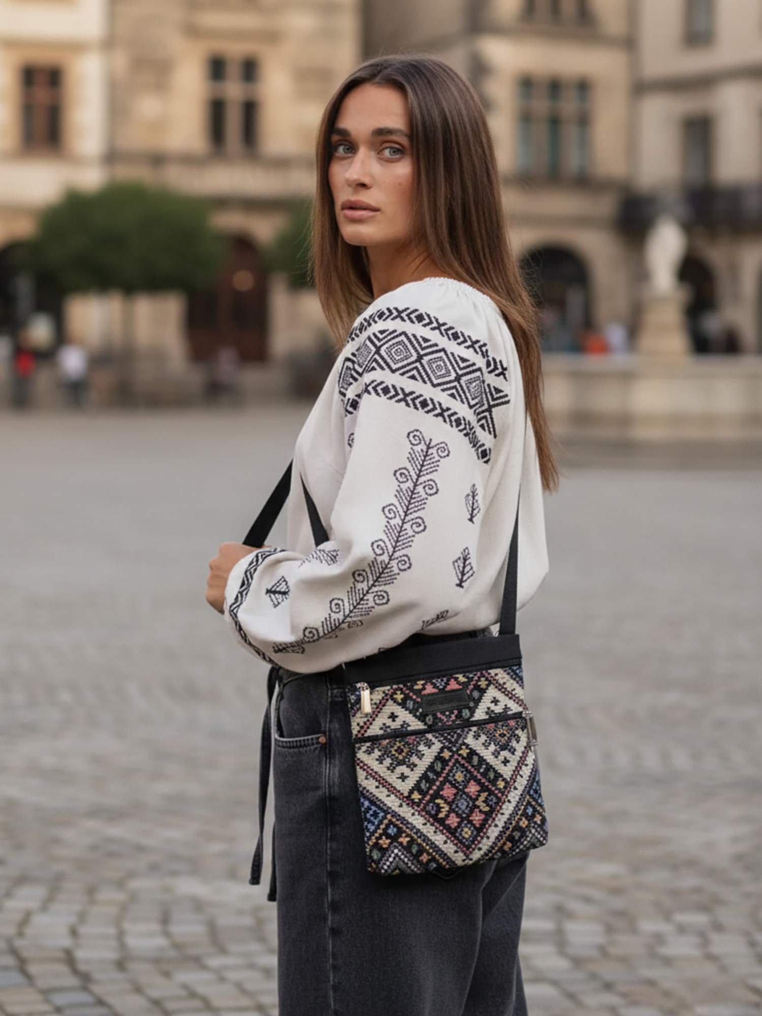 ✦ Виконана з міцної тканини – канвас чорного кольору. Та декорована гобеленом із візерунком, що нагадує традиційну українську вишивку.