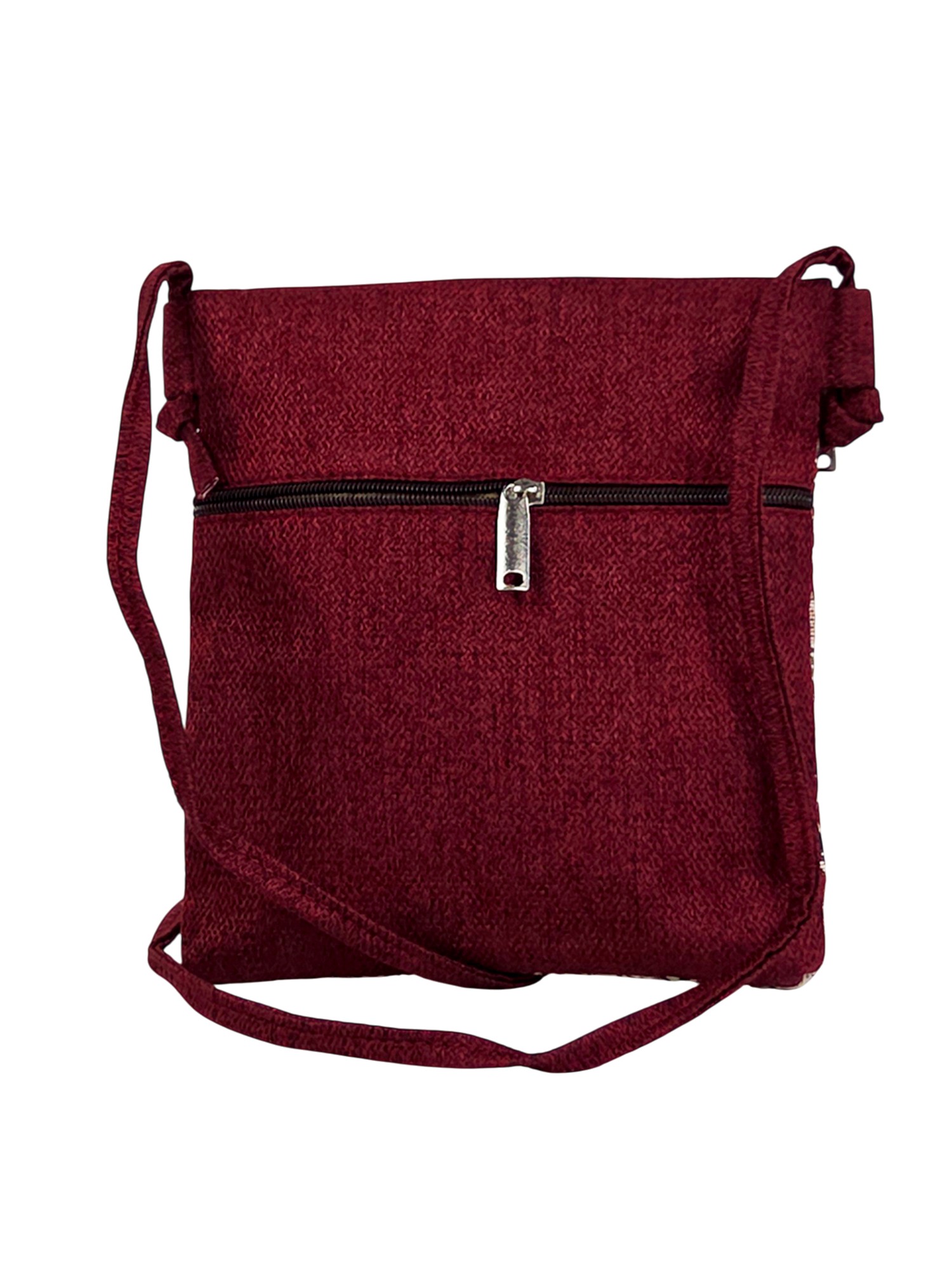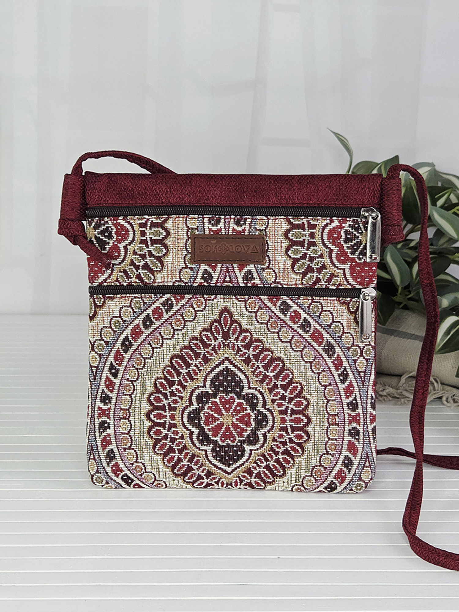 💢 Виконана з міцної тканини – рогожка. Та декорована гобеленом з бордовим етнічним візерунком.