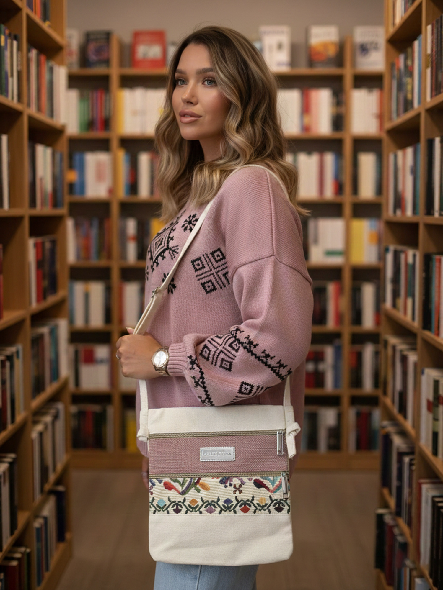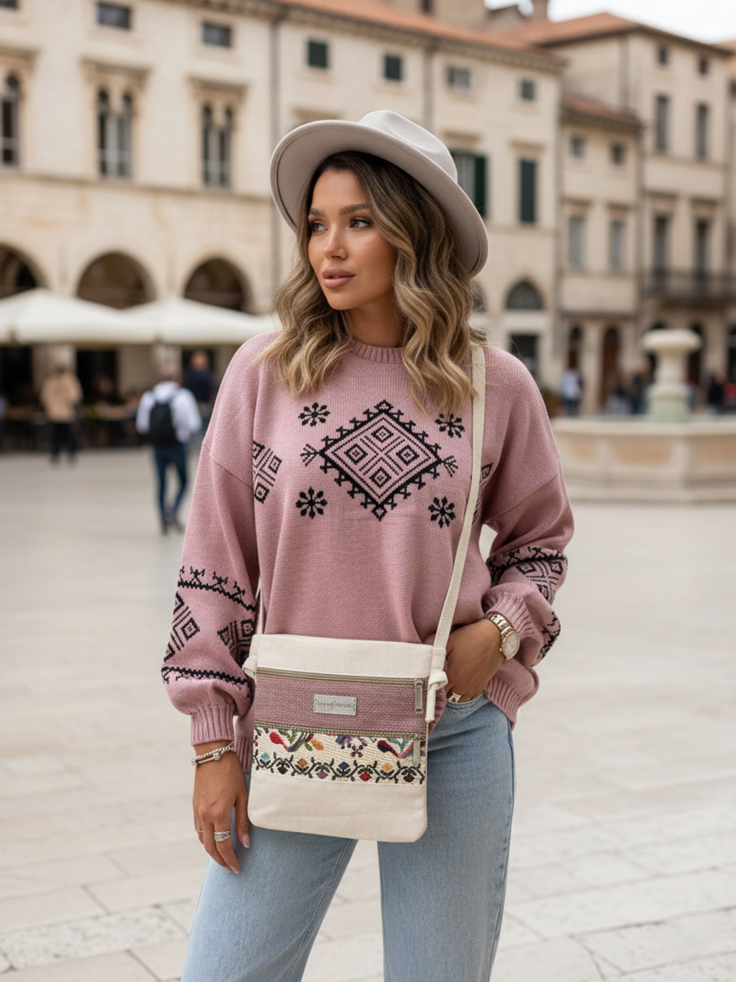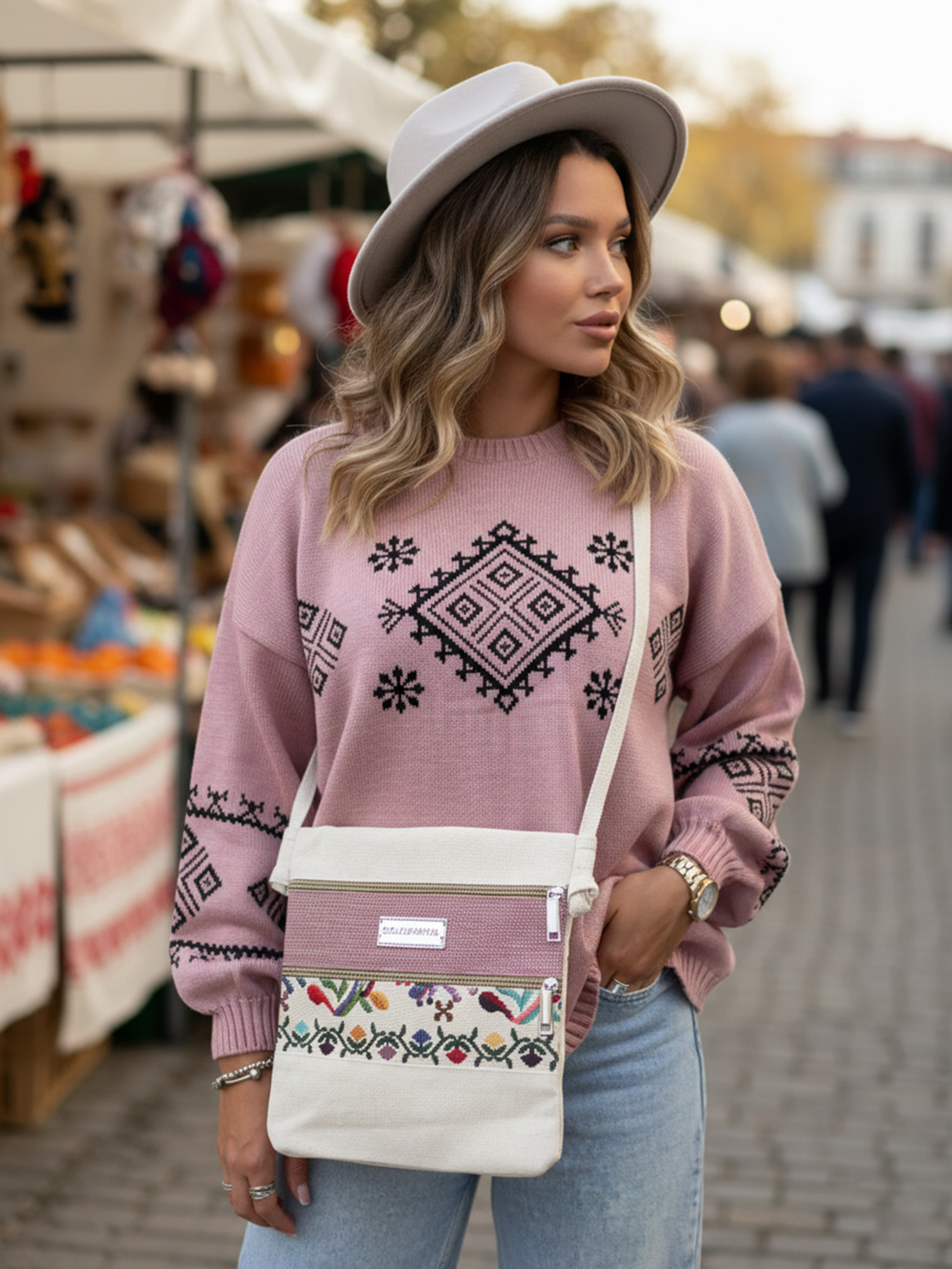 Додайте у свій гардероб цю ніжну молочно-рожеву сумку з барвистим орнаментом, яка легко поєднується з літніми й весняними образами та дарує яскравий настрій.