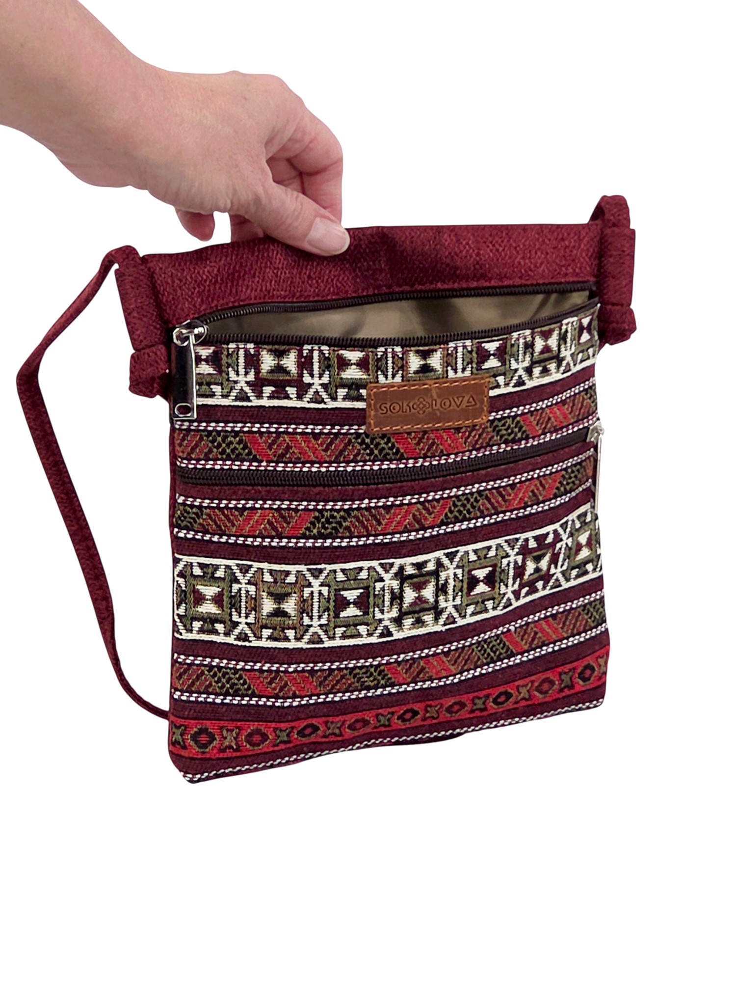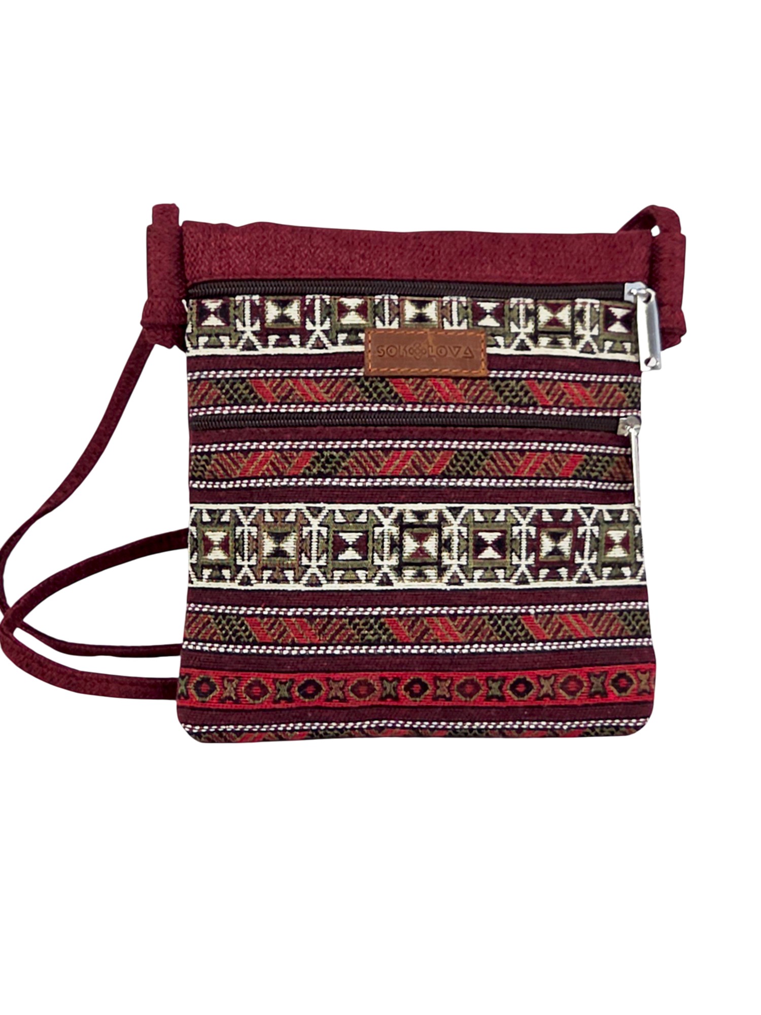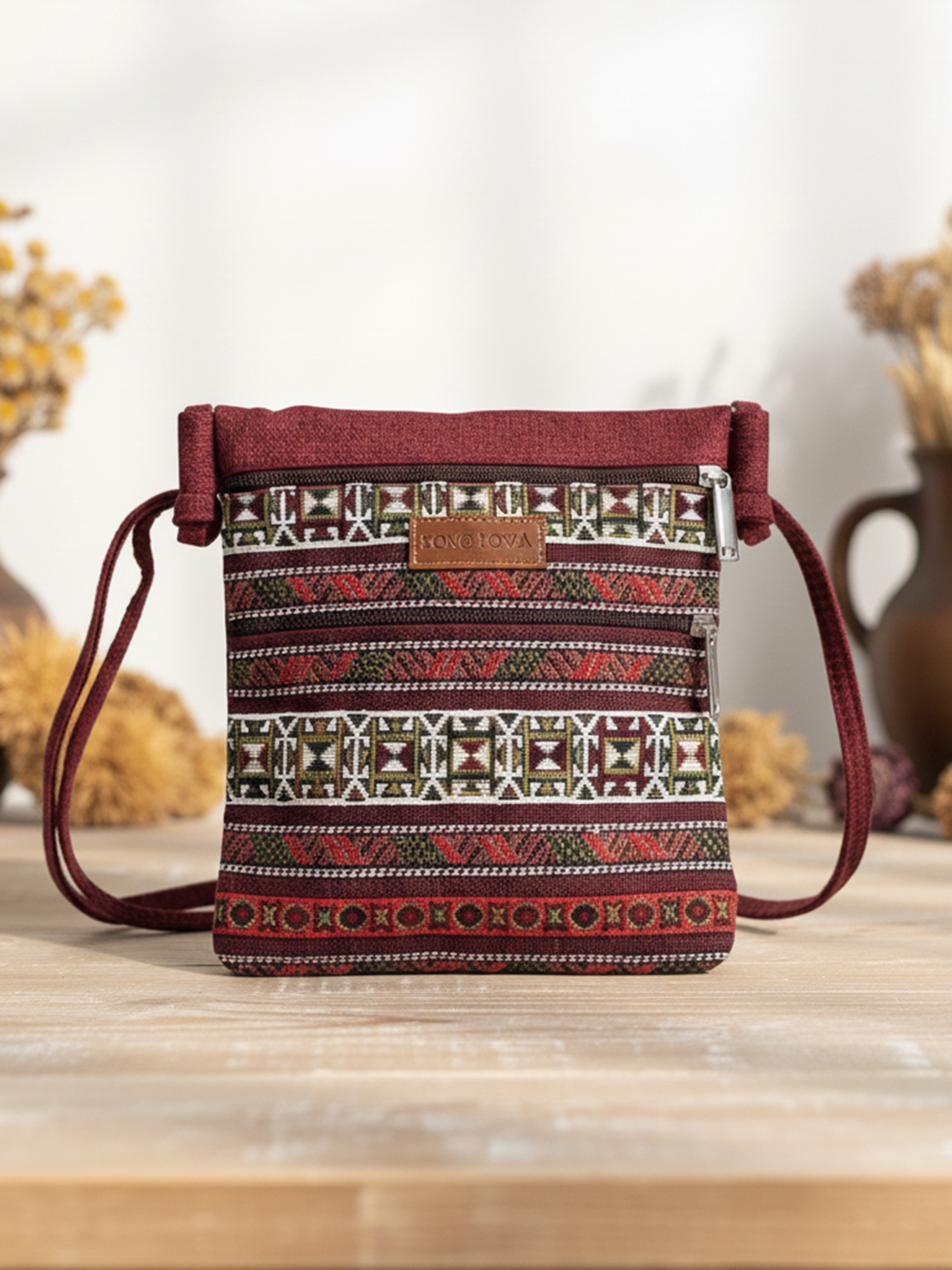 Бордова сумка з геометричним орнаментом від Sokolova — стильний та зручний аксесуар для повсякденного використання і прогулянок.