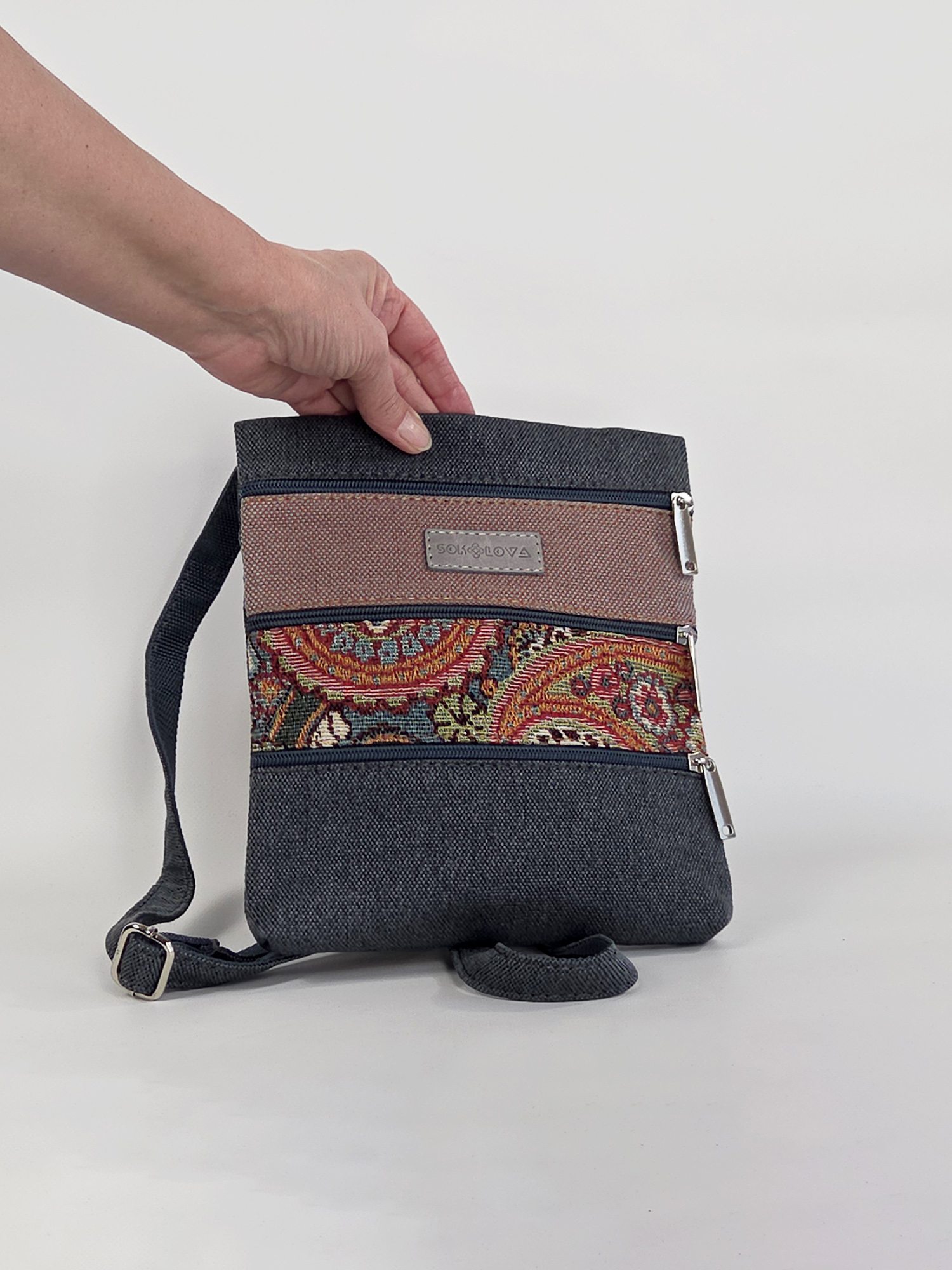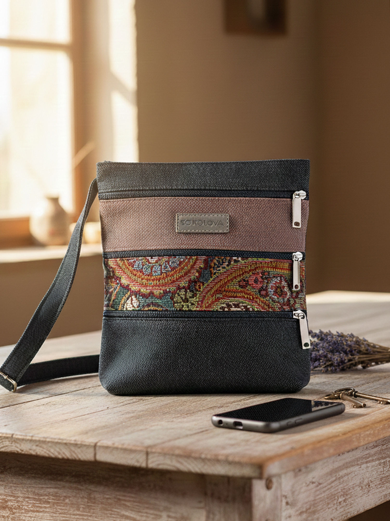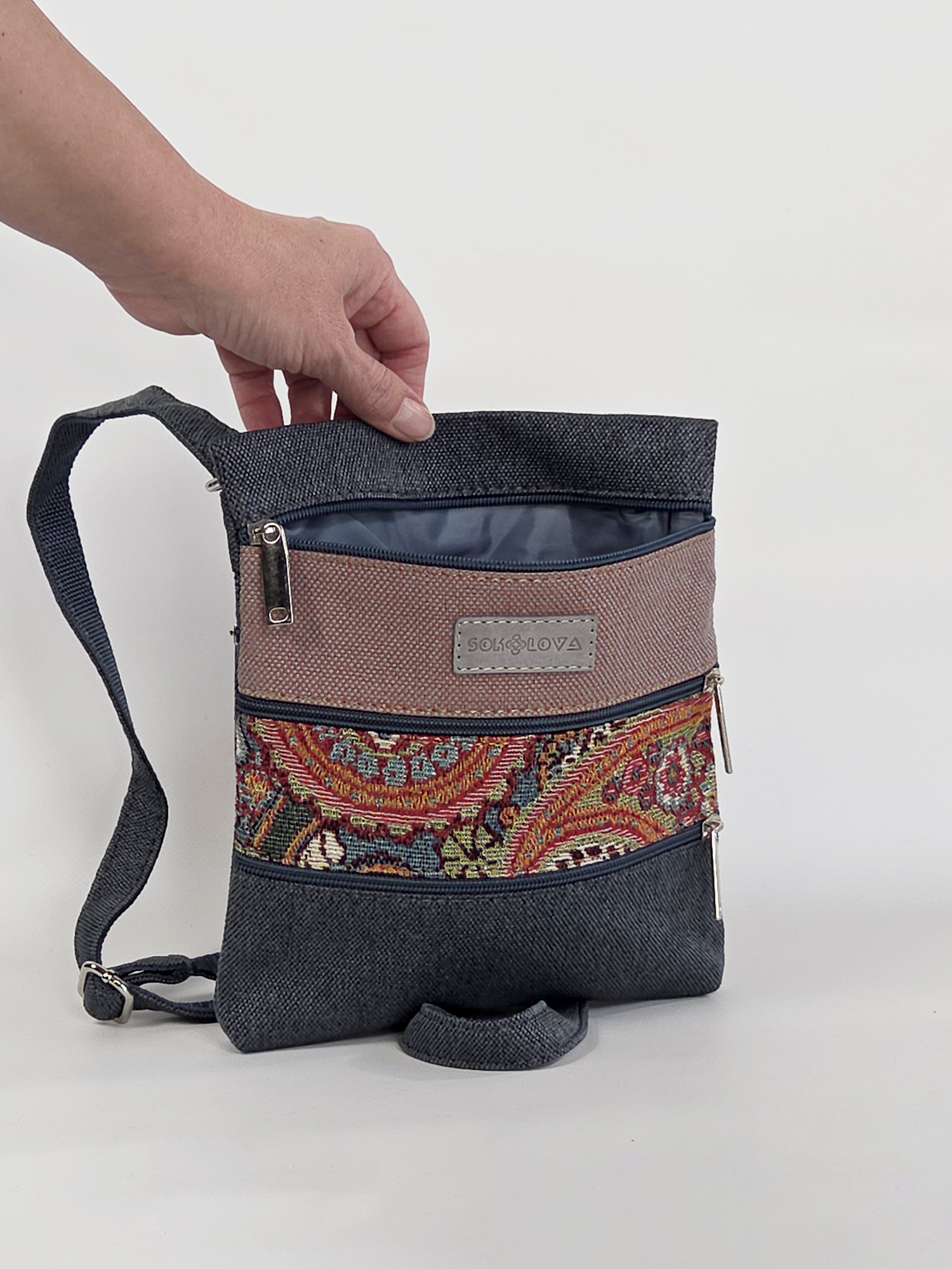Синя сумочка з темно пудровим декором від Sokolova. Компактна, містка та неймовірно зручна — ідеальна сумка для активного ритму життя.