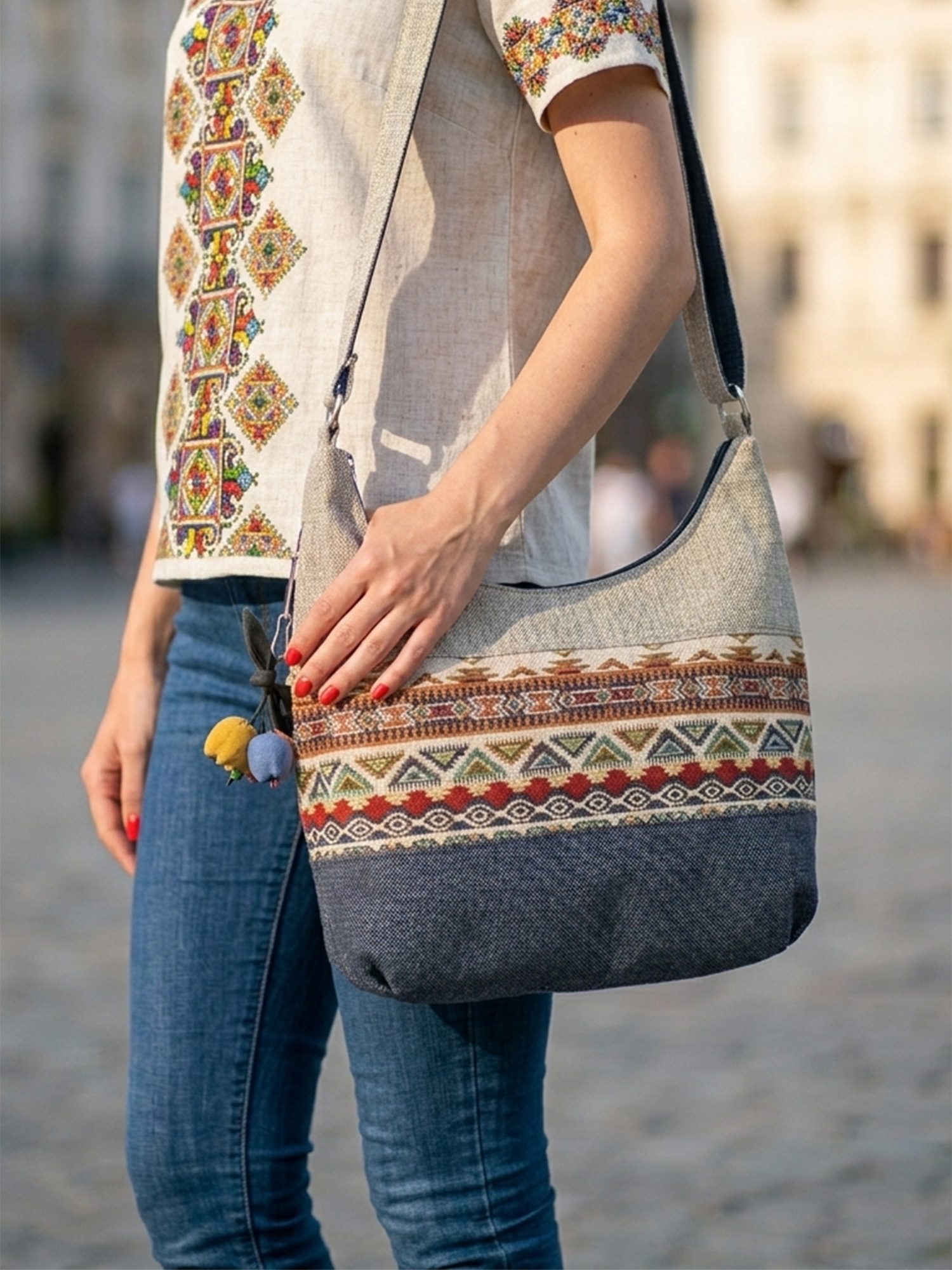 Міська сумка моделі «Либідь» — це зручний аксесуар на кожен день для тих, хто любить натуральні тканини. Вона виглядає цікаво завдяки гарному візерунку та природним кольорам.