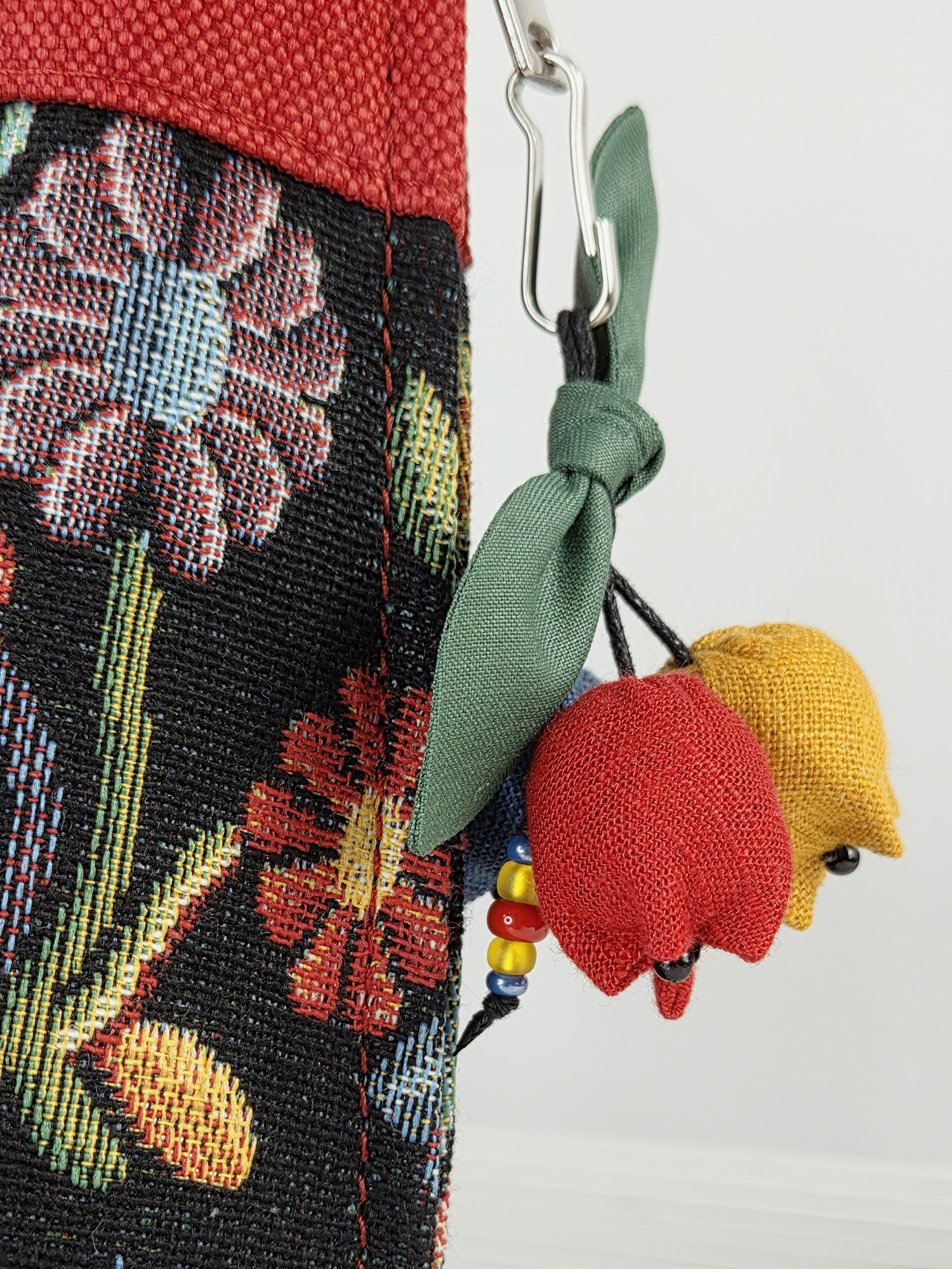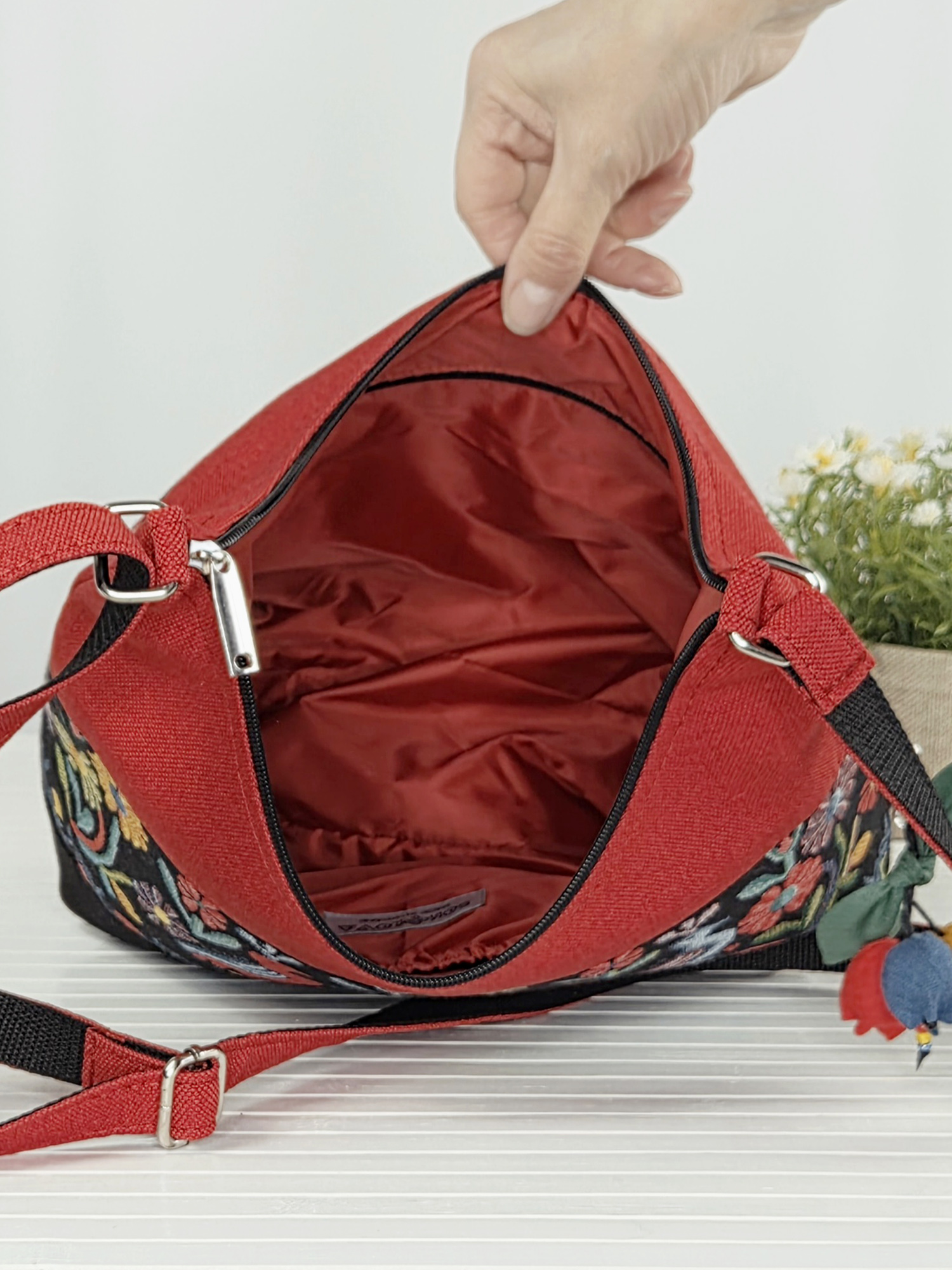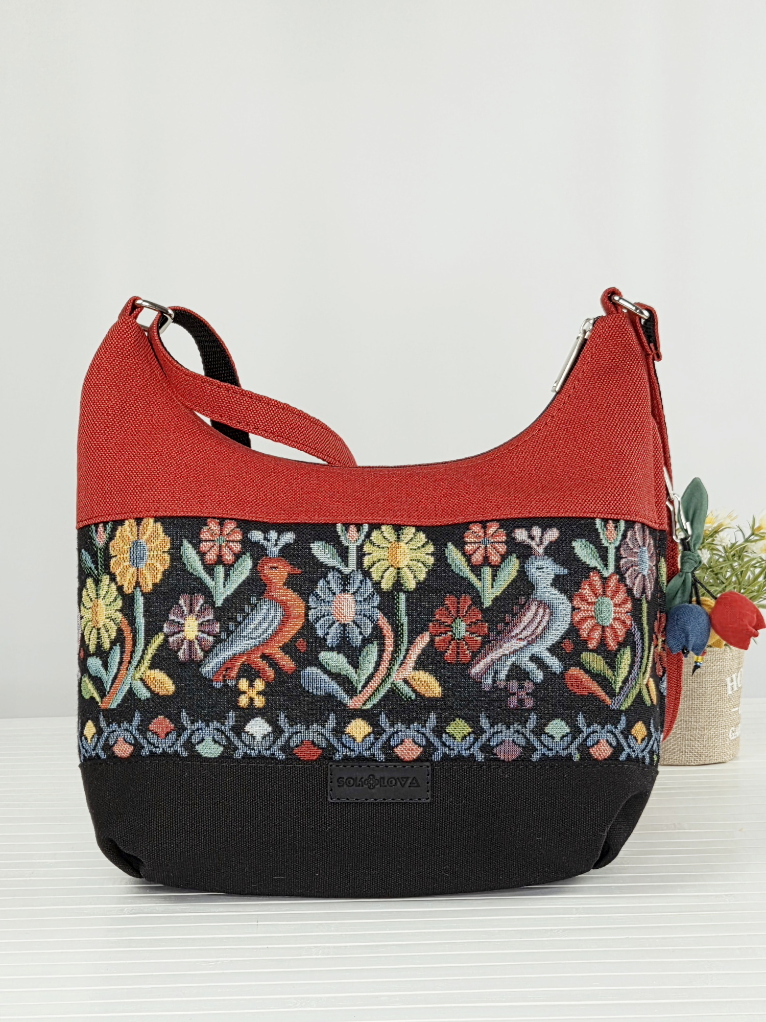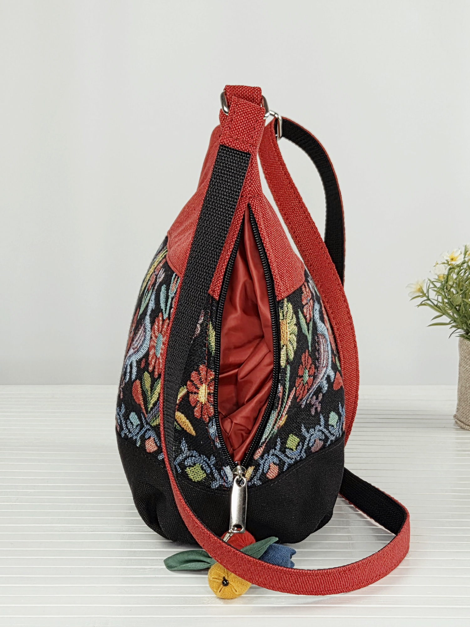 Ця червоно-чорна сумка моделі “Либідь” – ніби казковий світ, у якому розквітають дивовижні квіти, а між ними гордо крокують пави 🦚
