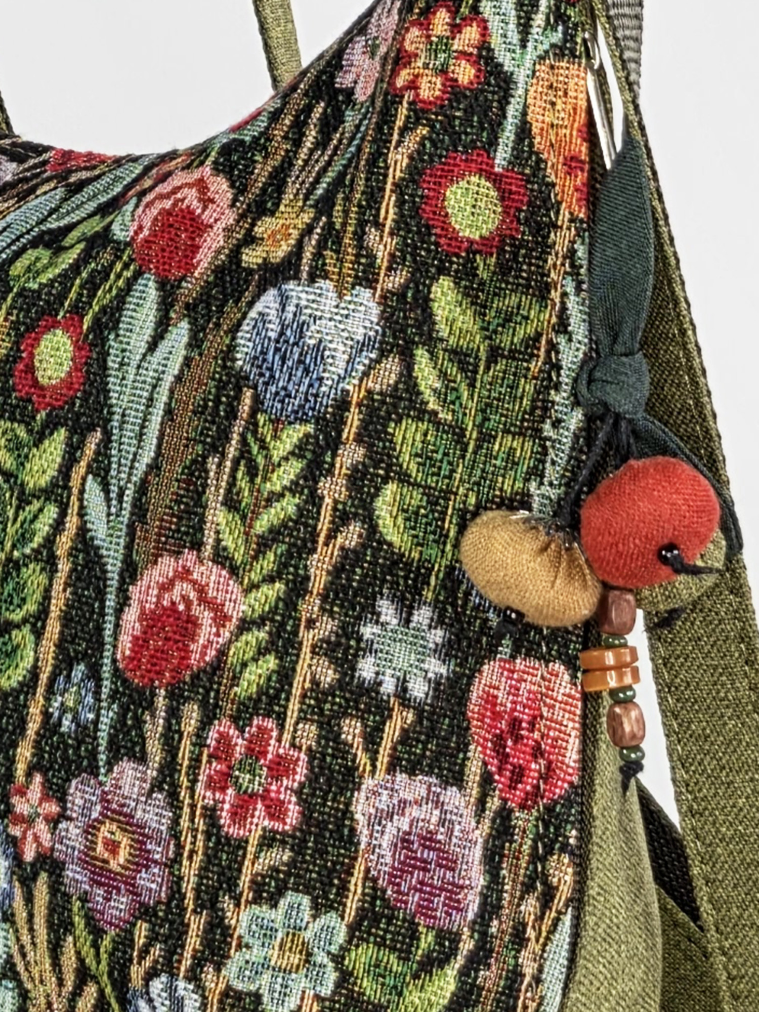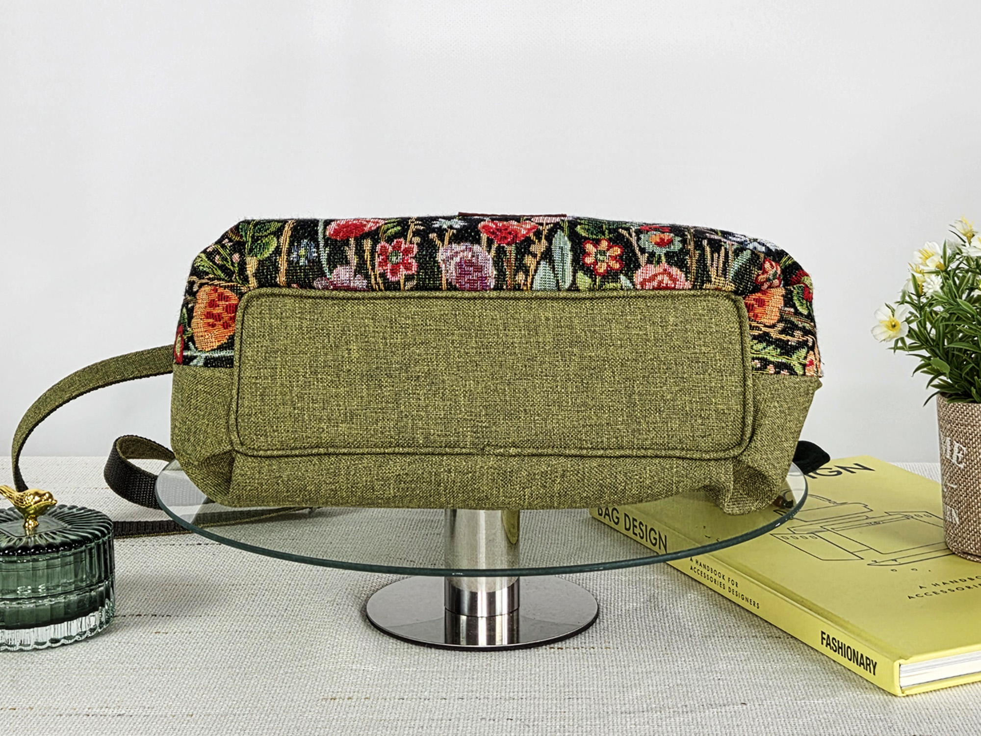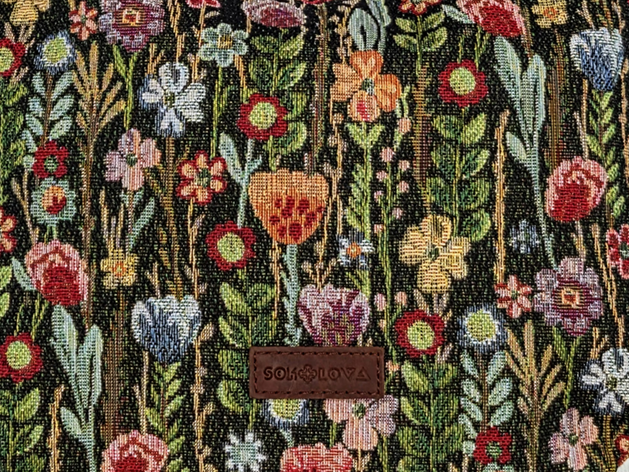 🌾 Комбінація матеріалів: Лицьова сторона виконана з художнього гобелена преміальної якості з насиченим квітковим візерунком. Зворотна сторона виготовлена з міцної рогожки зеленого кольору.