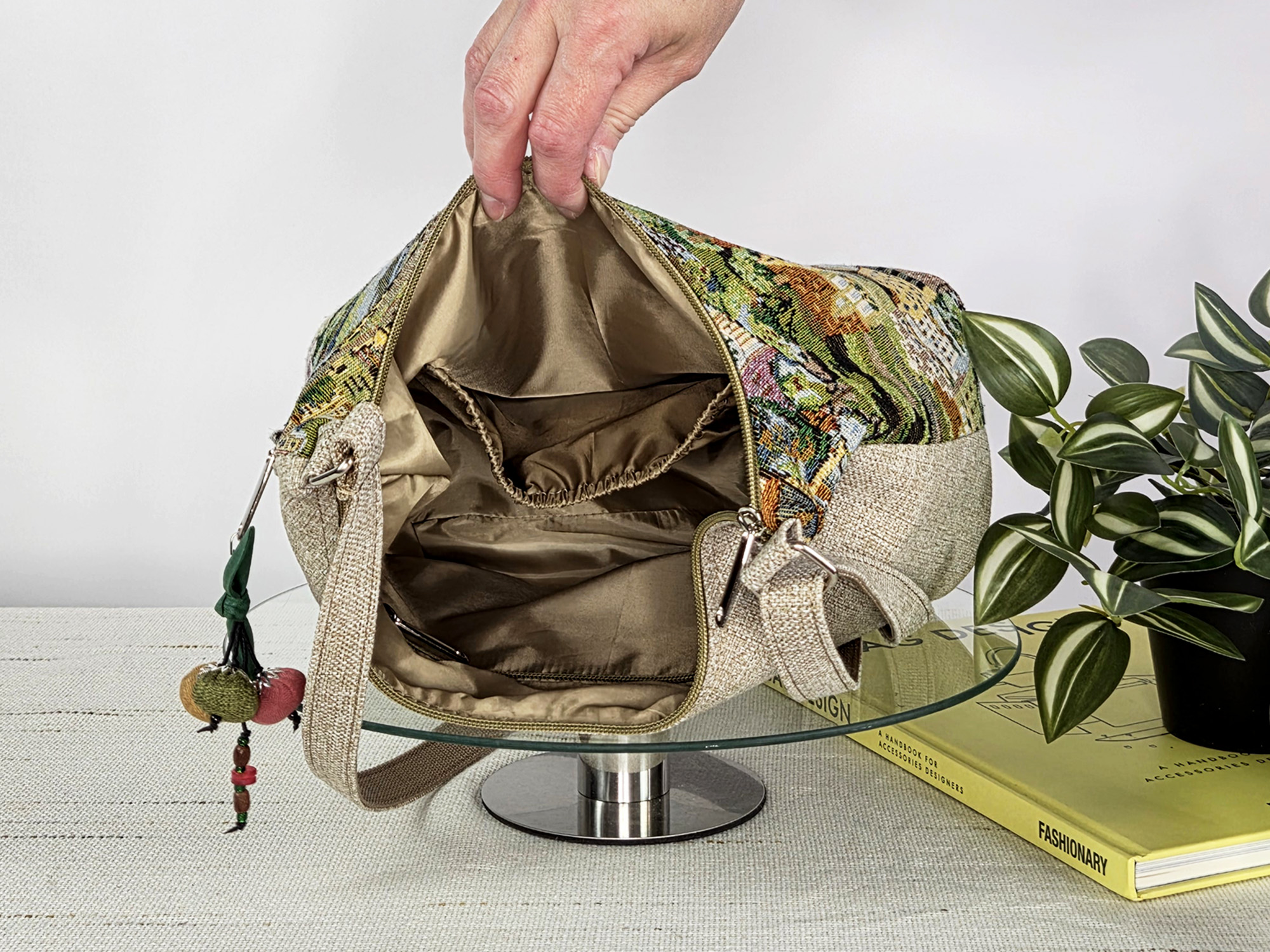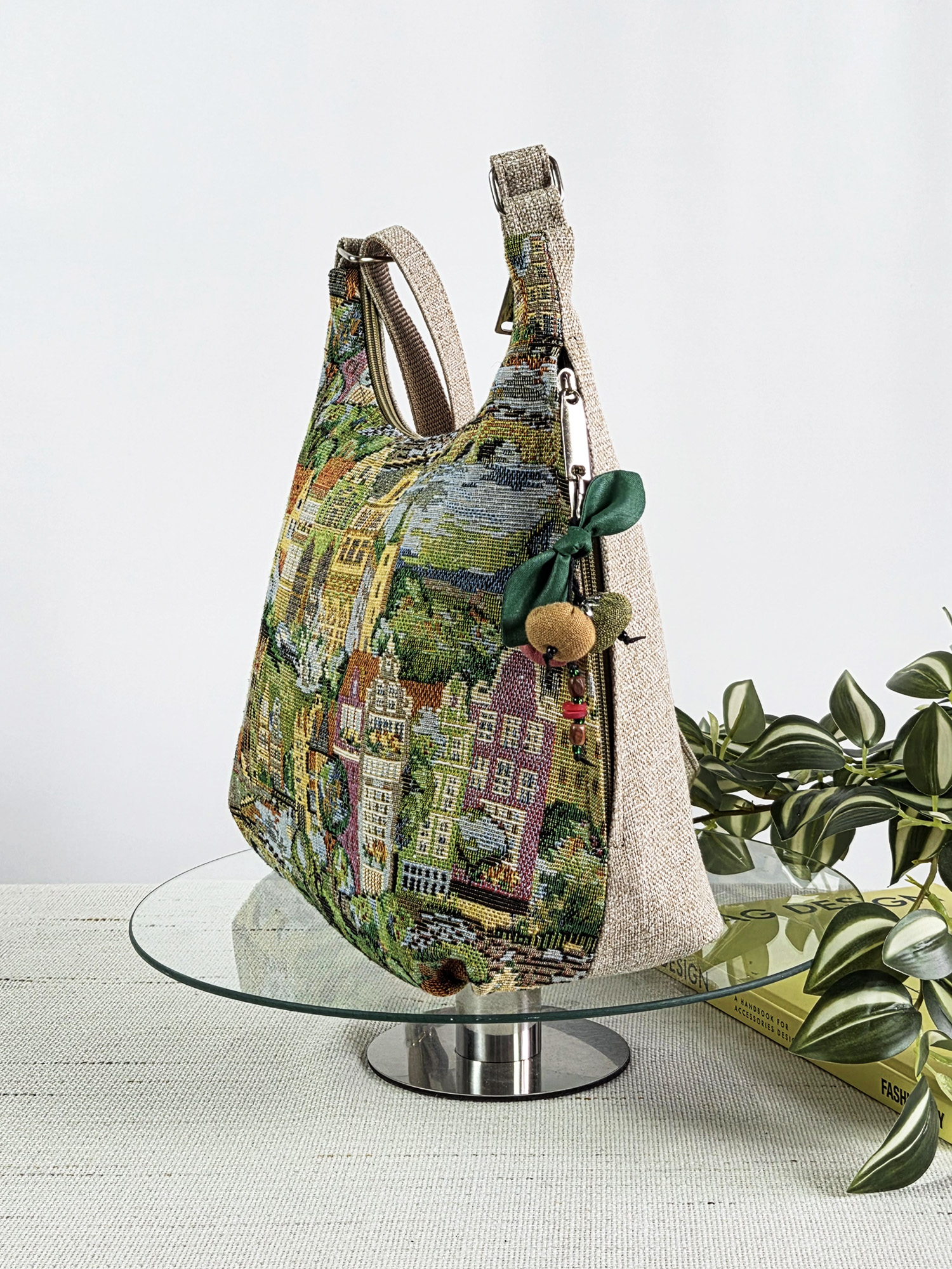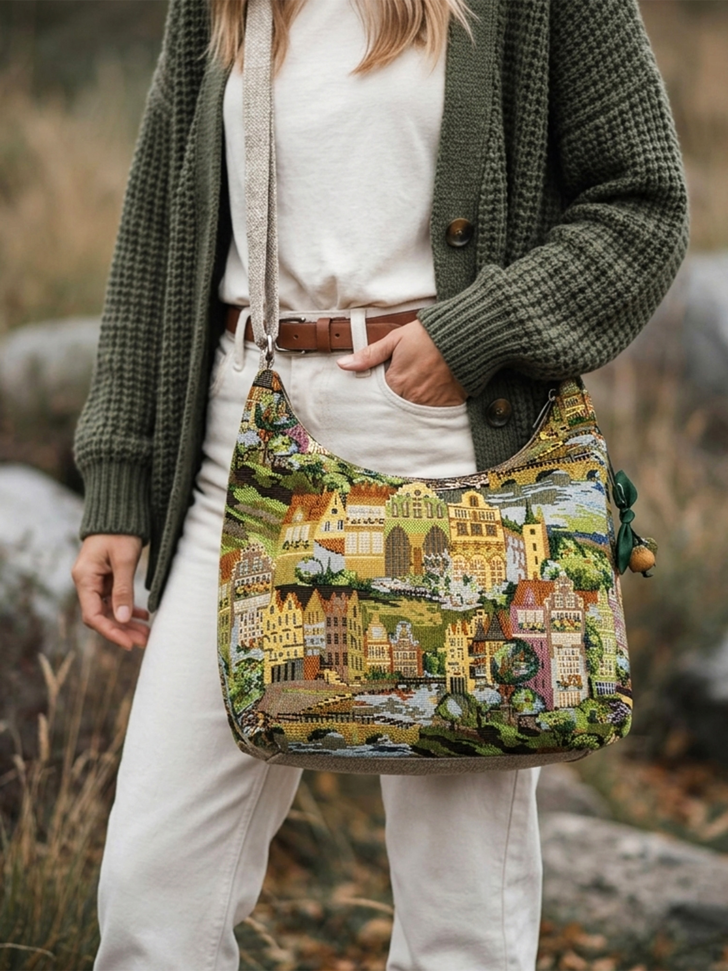 Ця жіноча сумка — справжня картина, втілена в текстилі, що перетворює звичайний аксесуар на подорож. Вона створена для тих, хто хоче додати у свій щоденний гардероб дрібку затишку й художнього стилю.