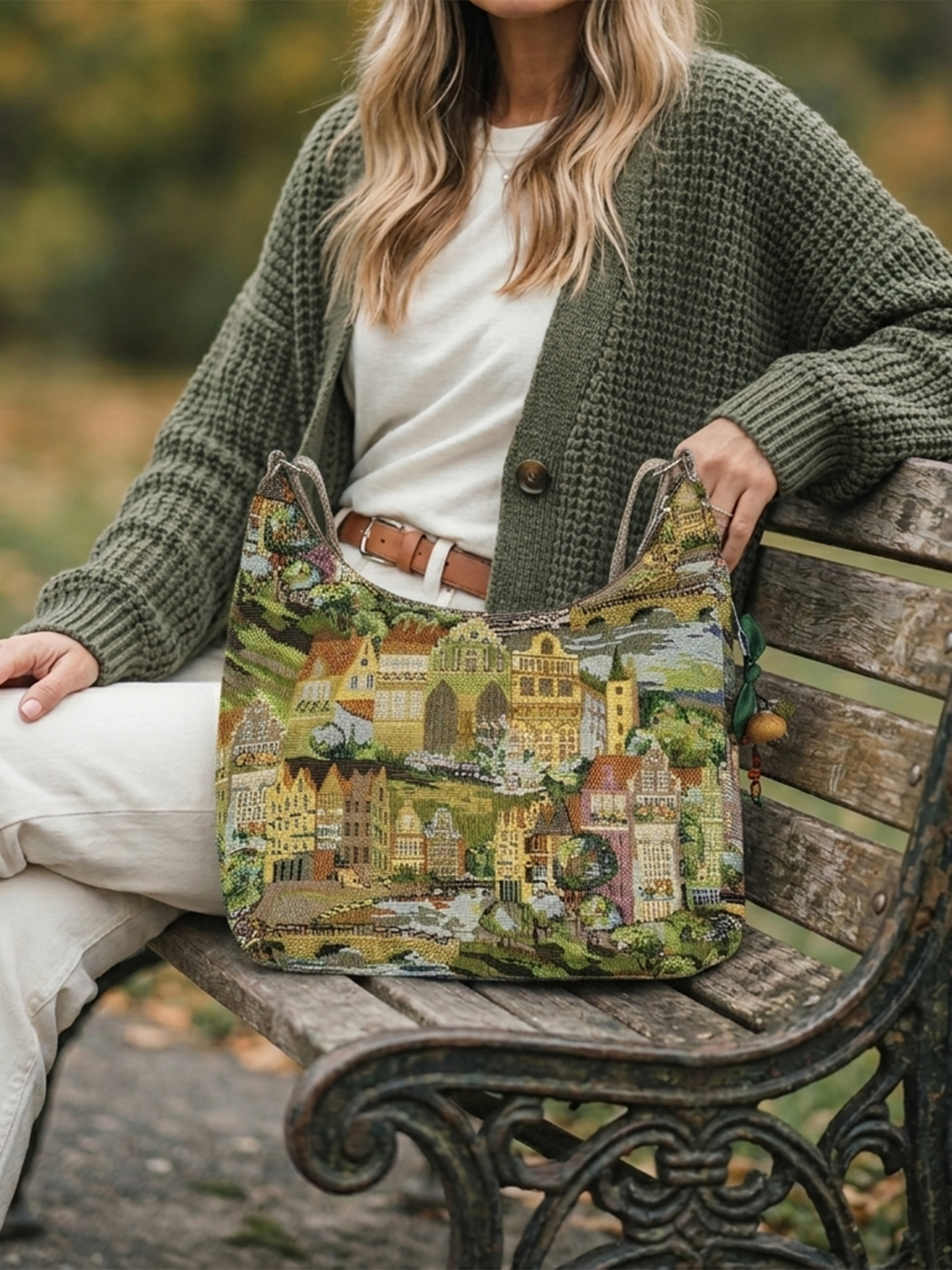 🏰 Мистецтво в деталях: Лицьова сторона виконана з художнього гобелена преміальної якості з мальовничим пейзажем старого міста. Зворотна сторона виготовлена з міцної рогожки, що гармоніює з природними відтінками візерунка.