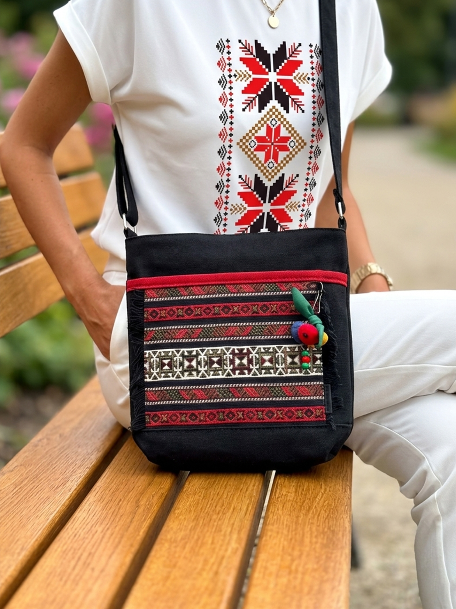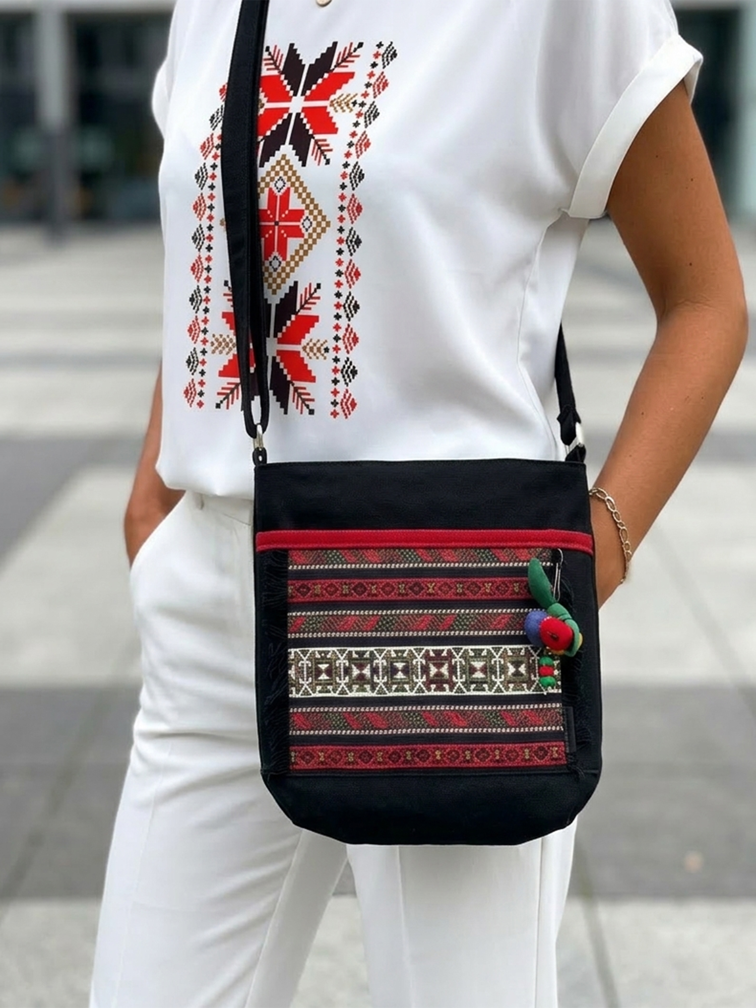 💢 Матеріали: Виконана з міцного й довговічного канвасу чорного кольору. Передня панель прикрашена гобеленом з геометричним орнаментом у бордово-червоних тонах.
